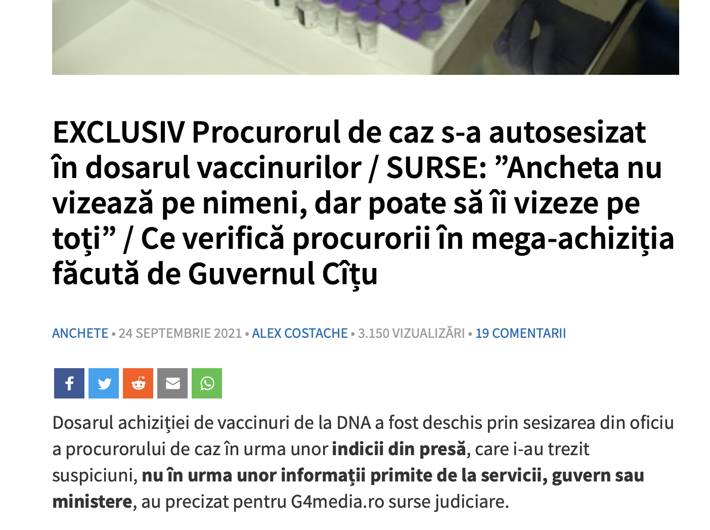 Costache zice că procurorul Adrian George Matei, şeful interimar al Secţiei 1 de combatere a corupţiei din DNA, căruia îi place să se îmbăţoşeze ca fiind „ăla de l-a trimis pe Dragnea la puşcărie”, ar fi deschis o anchetă in rem despre achiziţia de vaccinuri, făcută de România. Costache nu uită să spună că procurorul a fost premiat de Ambasada Americii, ba, în prostia lui, semnalizează că nici premierul Cîţu, nici Vlad Voiculescu nu sunt vizaţi.