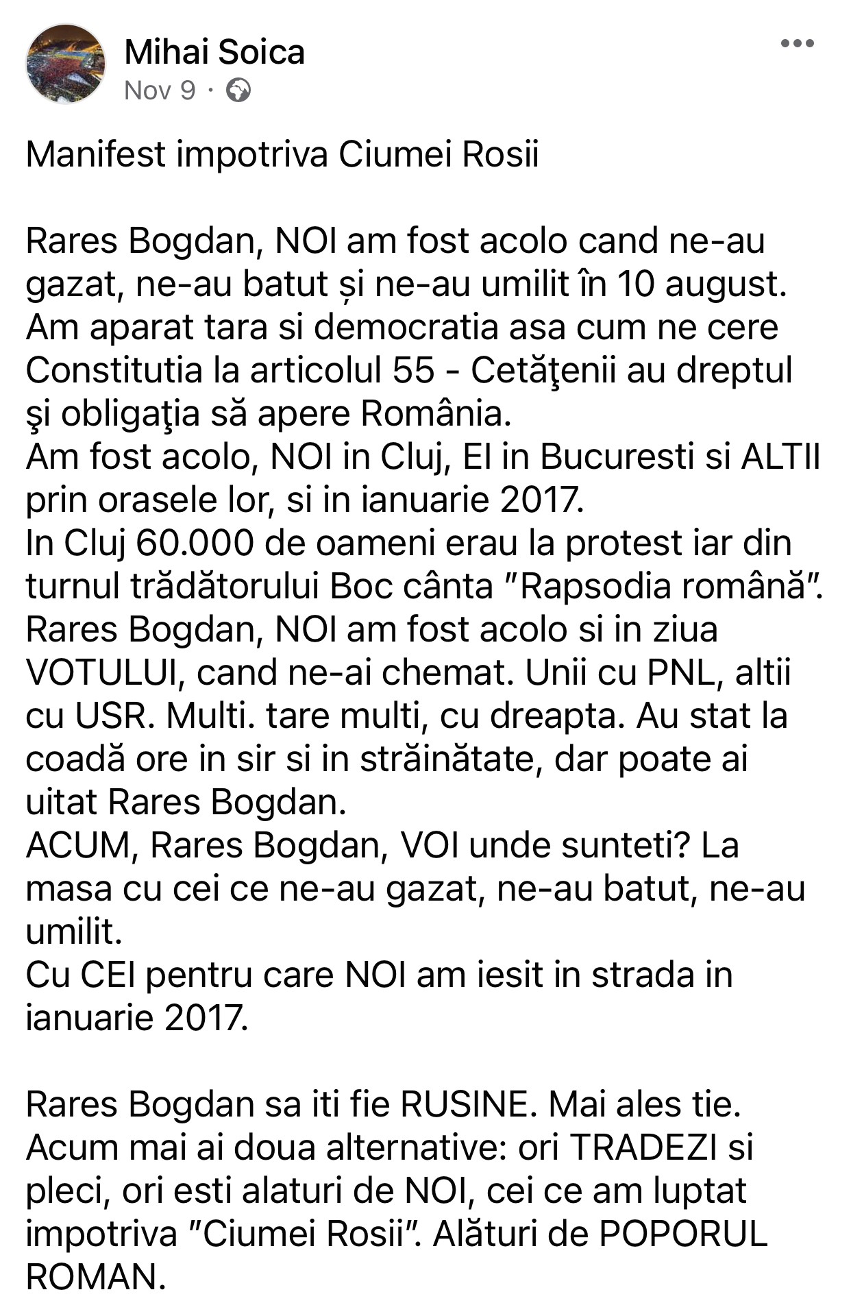 Exact acum 3 ani, într-o zi de miercuri, 21 noiembrie 2018, Rareș Bogdan posta pe contul său de socializare un mesaj plin de patos.