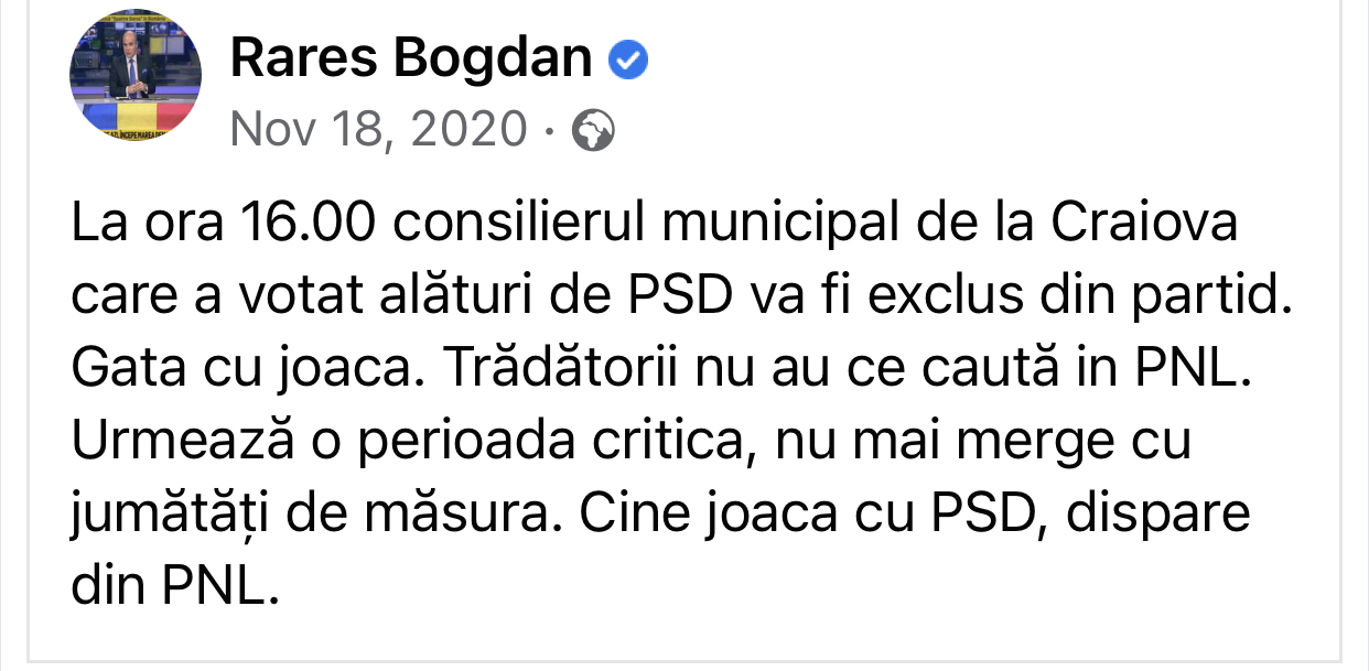 Ce vremuri! Pe atunci, vorbele lui Rareș Bogdan păreau tuturor ca apa proaspătă! Azi, alte vremuri: râd toți de el sau îl suduie cu sete, ca pe oricare alt politician mincinos. Ba, poate, cu și mai mult sârg, fiindcă Rares Bogdan a devenit emblema arivismului deșănțat, un Farfuridi 3.0, ba chiar mai imbecil politic decât Farfuridi, fiindcă toate automatismele lui de comunicare - "toleranță zero", "onoarea e totul", "dreptate până la capăt" - sunt astăzi cruci de bumerang ce revin cu viteză dublă și îi sparg dinții.Dar să nu ne grăbim. Amintirile merită savurate. Acum 3 ani, Rareș Bogdan zbiera că șeful postului Realitatea, Cozmin Gușă, l-a scos de pe post "până una alta". Mai toți au sărit cu gâtul pe Gușă, foarte puțini s-au întrebat însă, cunoscându-l pe Gușă, de ce o fi recurs la un gest atât de drastic.Postarea de acum 3 ani pâlpâie în continuare pentru cei ce știu să revină la ea, ca o lumânare virtuală, ca un short reminder al ipocriziei caracteriale a acestui om pe care și noi, ziariștii, l-am susținut, crezând că nu va uita de breaslă: haha, am fost niște naivi.