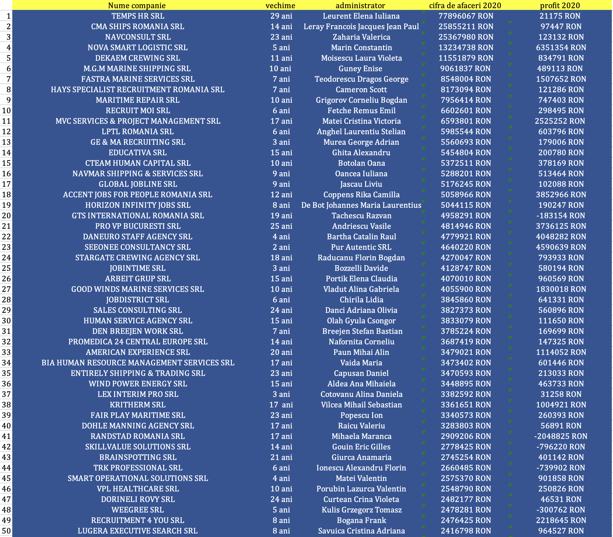 Cea mai puternică firma, aia cu 80 de milioane de lei, Temps HR, declară însă doar 5000 de euro profit. Nesimțire. Și asta e un "obicei" pe care multe companii de recrutare a forței de muncă îl au.