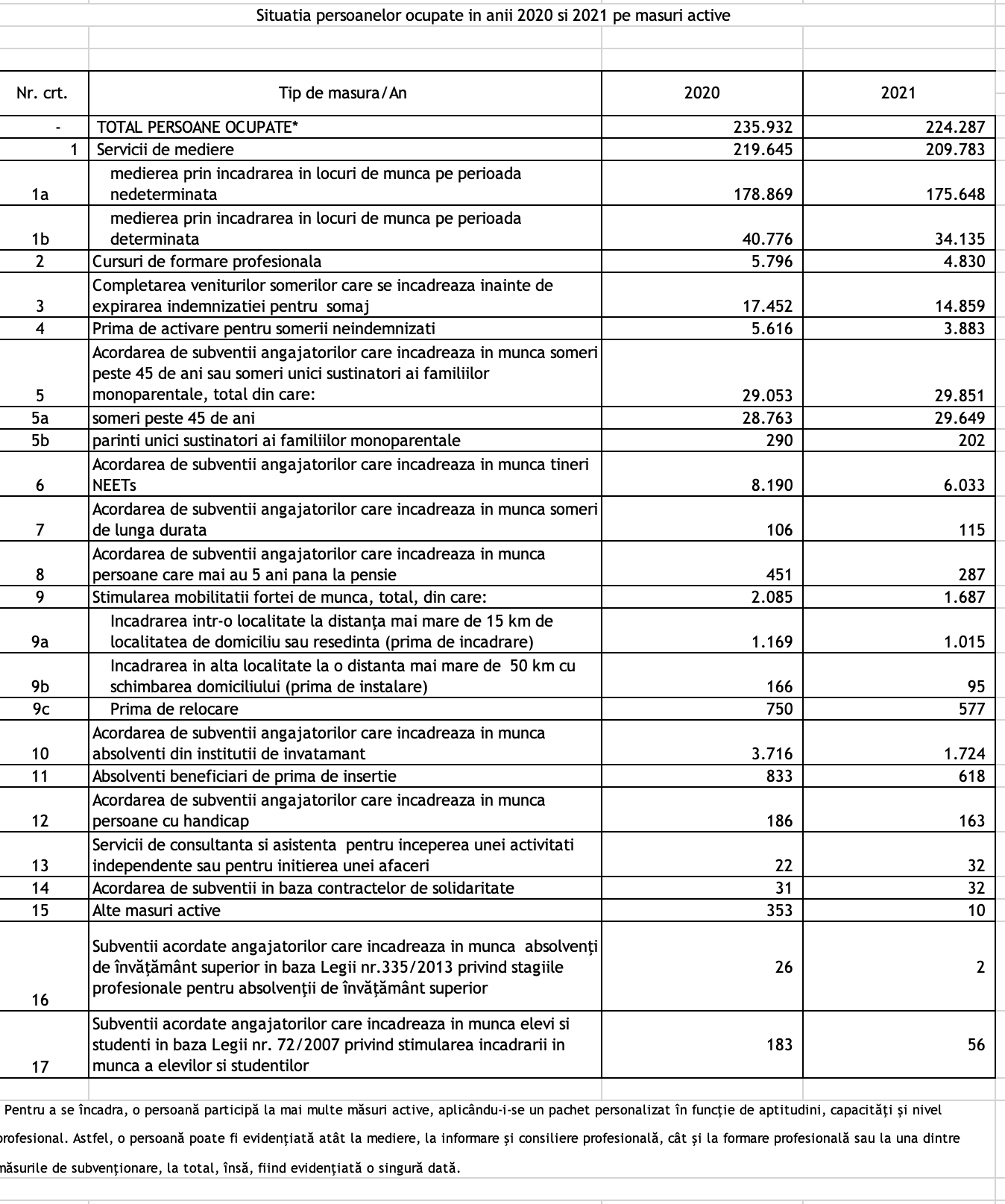 „Începând cu anul 2018, ANOFM a semnat și a demarat implementarea unui număr de 19 proiecte cu finanțare din FSE prin POCU 2014 – 2020, dintre care 13 sunt în prezent în derulare. Acestea au rolul de a crește gradul de ocupare a persoanelor inactive și a șomerilor înregistrați în baza de date a agențiilor teritoriale pentru ocuparea forței de muncă. Suma totală contractată este de 5.315.623.361,26 de lei (peste 1 miliard de euro). Până în prezent, prin intermediul proiectelor derulate de ANOFM, 1,38 milioane persoane au beneficiat de susținere în vederea angajării prin oferirea de prime, subvenții acordate angajatorilor sau de unele măsuri stabilite în context pandemic”, mai susține purtătoarea de cuvânt a ANOFM.