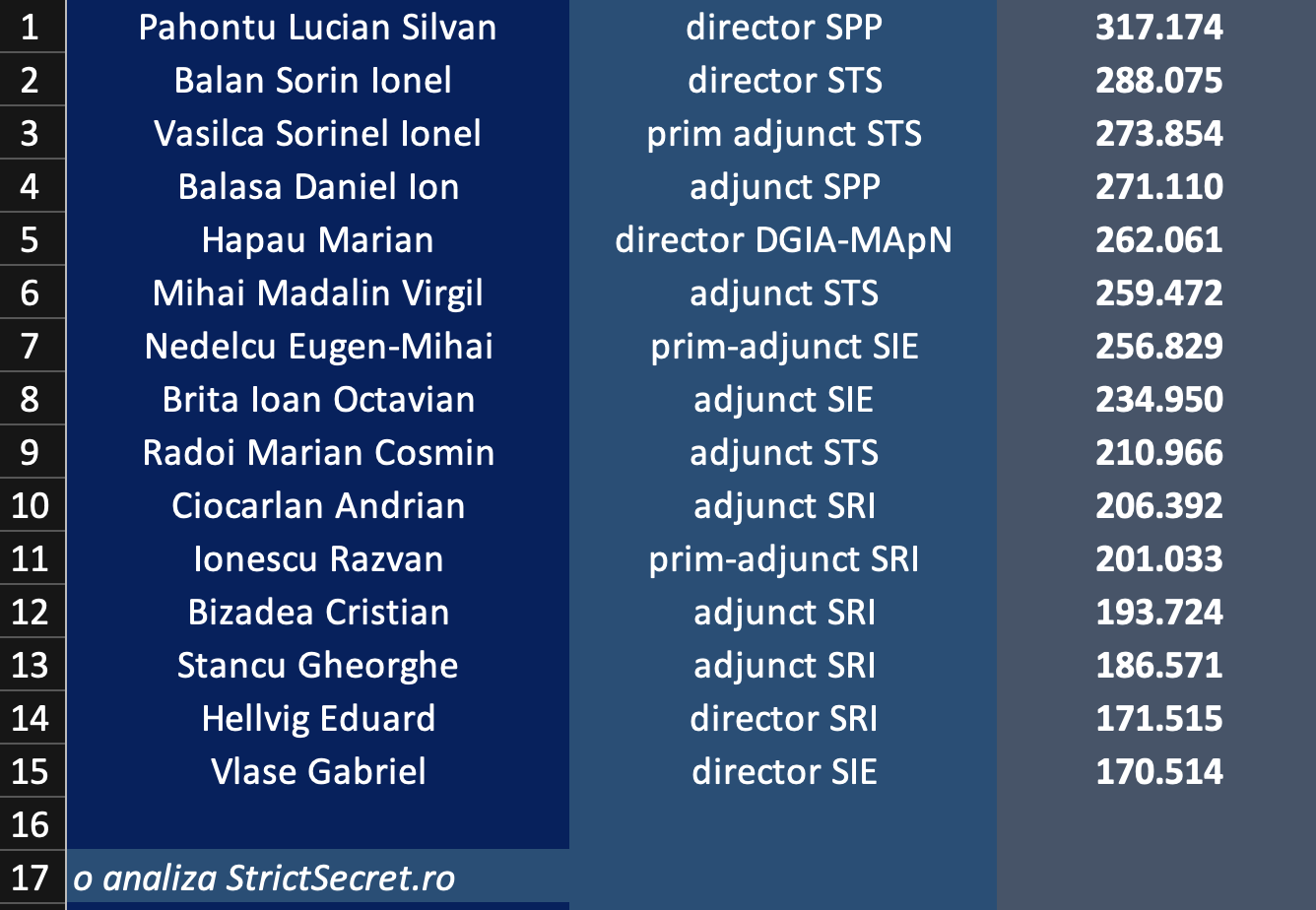 Sigur, poate le-ați mai văzut separat, în câte un articol, dar niciodată "în bloc". Fără să discut competența celor din SPP și STS, dar cât de normal este că ei să fie în topul salariilor șefilor de servicii secrete și șefii SRI și SIE la coadă?