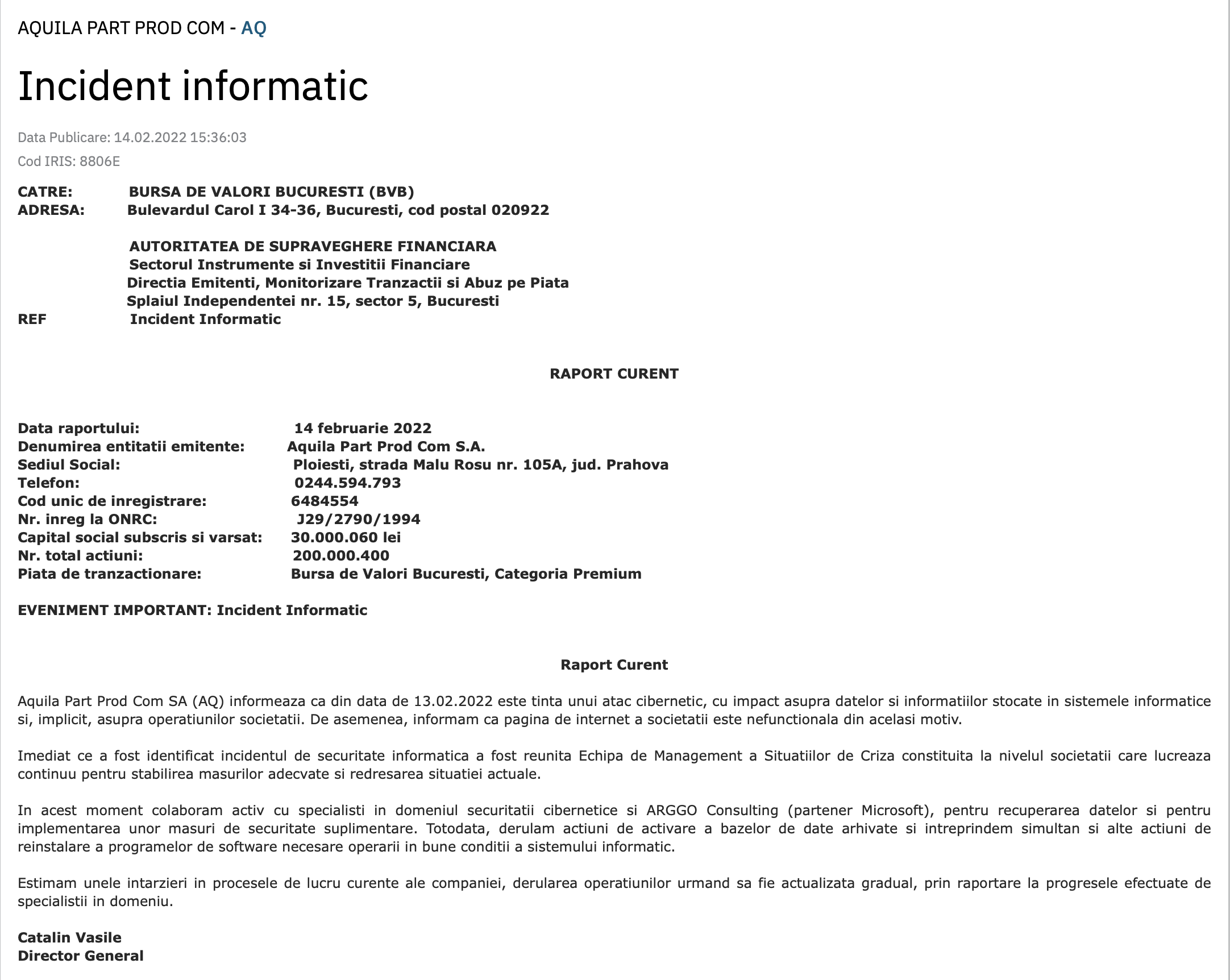 În 14 februarie, la ora 15, AQUILA a catadicsit să anunțe și bursa că există "un incident informatic". Strict Secret știa de incident, însă nu am reușit să contactăm niciun membru al managementului AQUILA pentru un comentariu.
