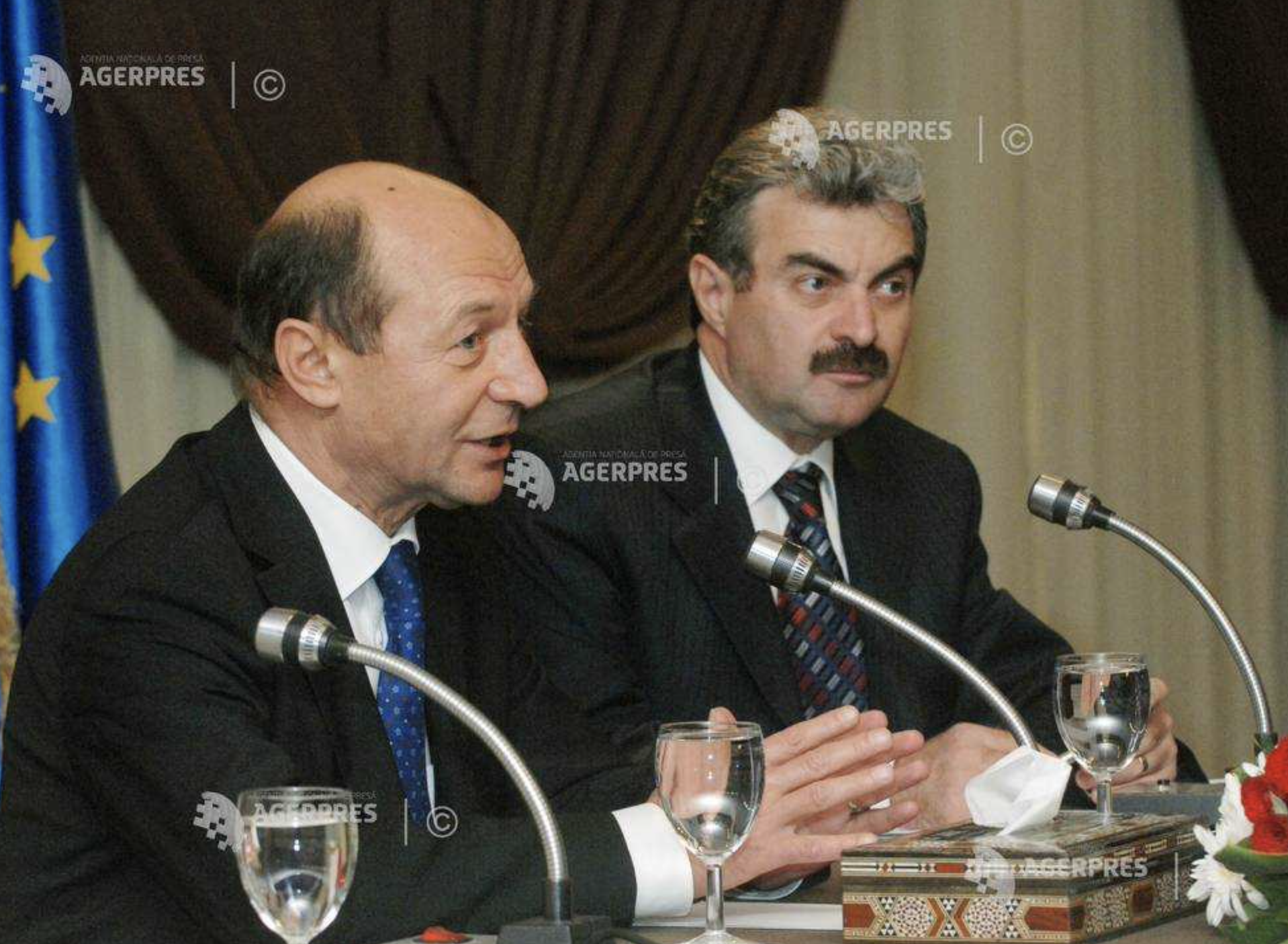20.10.2008 - Presedintele Traian Basescu si Danut-Florin Sandovici, ambasadorul Romaniei la Damasc, la intalnirea cu reprezentantii comunitatii romanesti din Damasc cu ocazia vizitei de stat a presedintelui Traian Basescu in Republica Araba Siriana. (credit foto Agerpres - n.r.: din pacate, in 2021 si in era tehnologiei, Agerpres nu are integrat modul de plata online a fotografiilor)