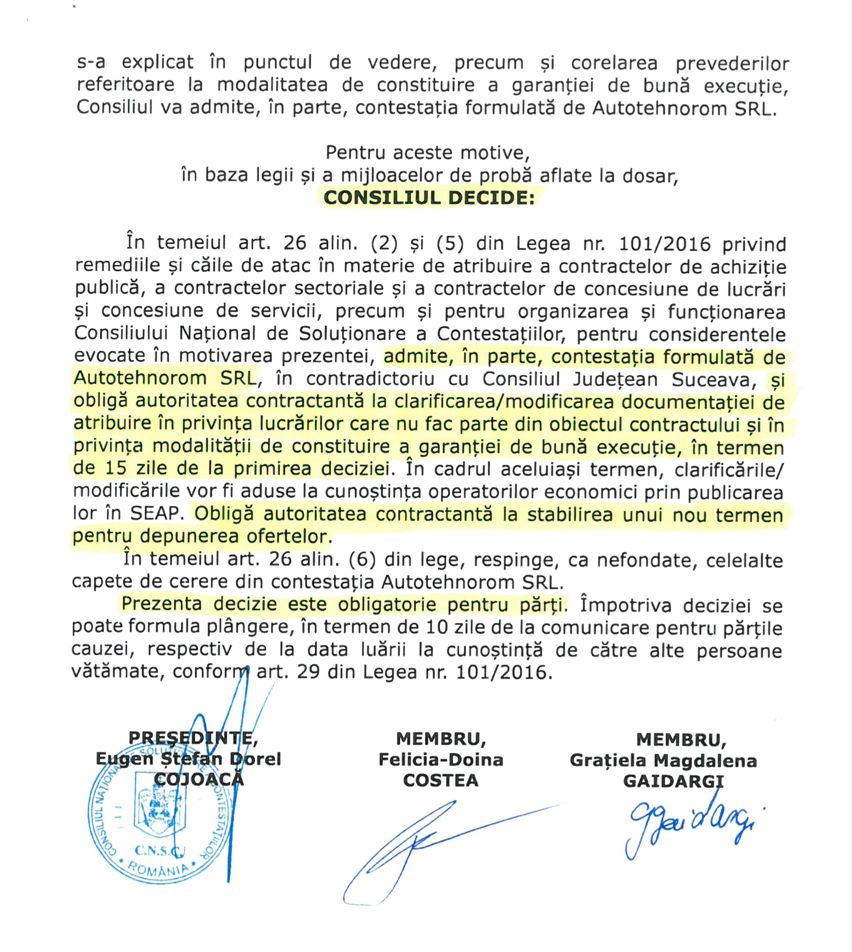 Pe 26 octombrie, Consiliul Național de Soluționare a Contestațiilor a admis în parte acțiunea Autotehnorom și a impus autorității contractante – Consiliul Județean Suceava, să clarifice/modifice documentația de atribuire în privința lucrărilor care nu fac obiectul contractului și în privința modalității de constituire a garanției de bună execuție, în termen de 15 zile de la primirea deciziei”.