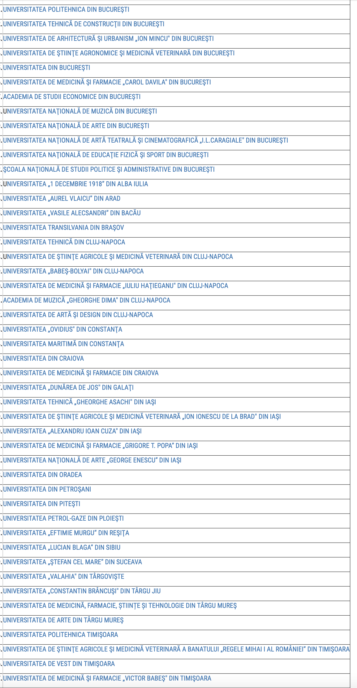 55 de universitati de stat romanesti, mai ceva ca magazinele Mega Image Dacă vă vine să credeți, din bugetul public, noi, românii, susținem cu cașcaval nu mai puțin de 55 de unități de învățământ superior de stat, din care 7 au caracter militar. Practic, fiecare regiune istorică a ajuns să aibă constelația ei de universități. Dacă a vrut parlamentarul Gogoașă să facă universitate la Reșița sau la Suceava sau la Petroșani sau Alba-Iulia, asta s-a întâmplat. Multe dintre aceste "universități" nu valorează nimic din punctul de vedere al standardelor, însă poporul e nevoie să plătească an de an aberația existenței lor.