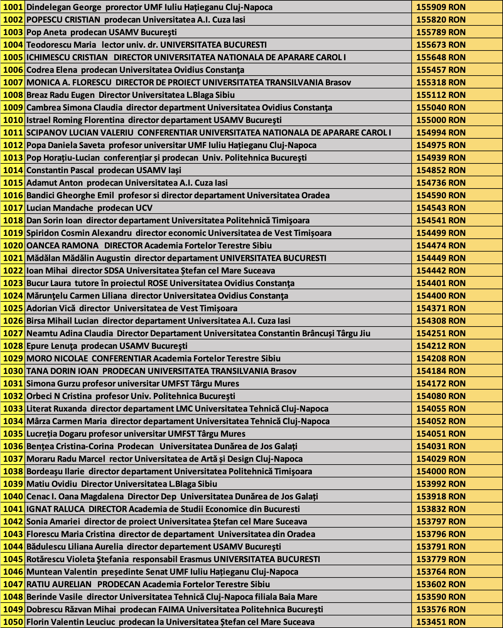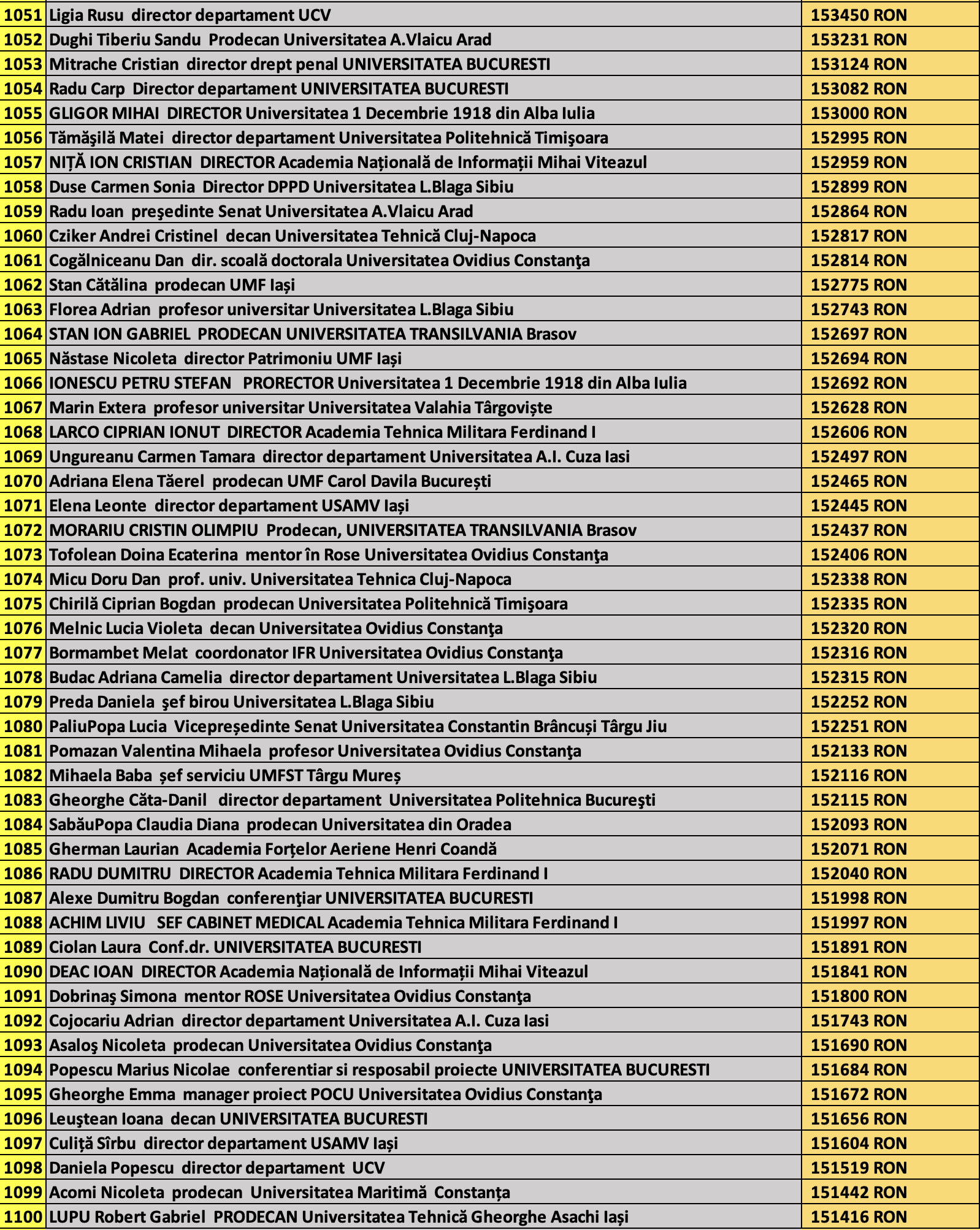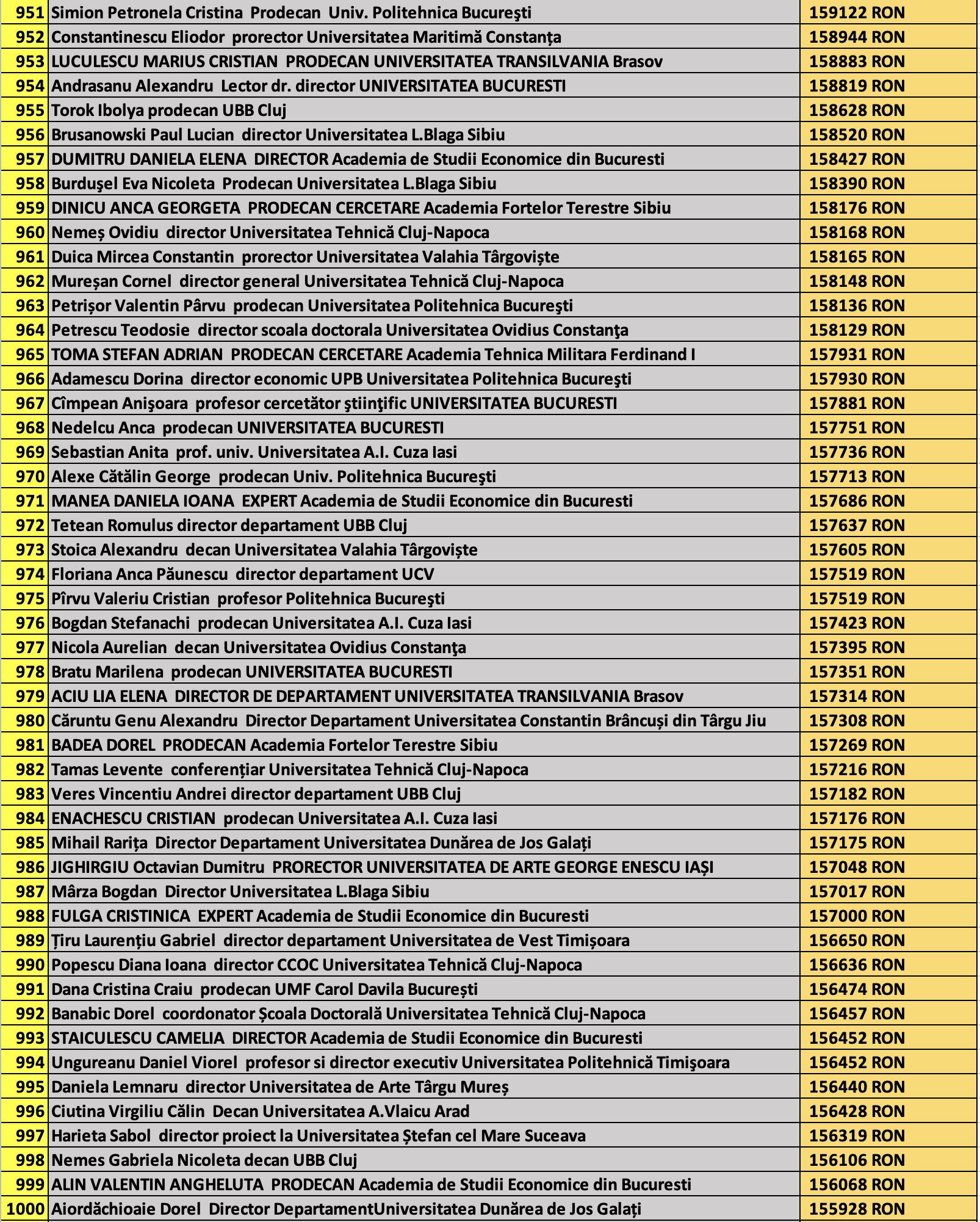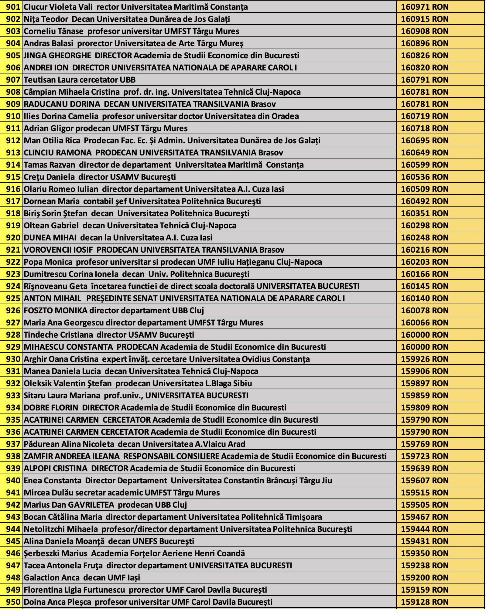 desi mai jos aveti 1100 de salarii super babane din mediul universitar de stat, sa nu uitati ca, de la locul 1100 in jos, cateva zeci de mii de atarnatori sug si ei salarii foarte bune, chiar daca mai mici decat ale bastanilor. Universitatile de stat romanesti sunt sinecuri extraordinare, unde munca e putina, salariile superbe si mereu e rost de spagi, daca te ocupi de achizitii sau de alte "intreprinderi" lucrative.