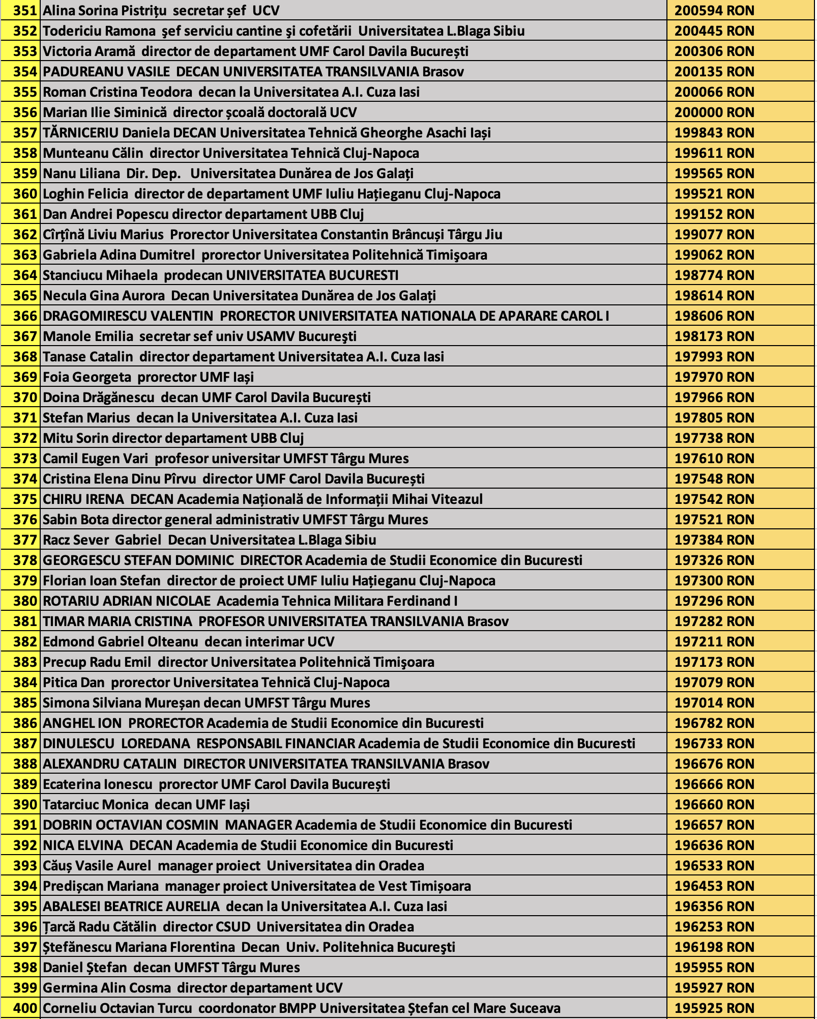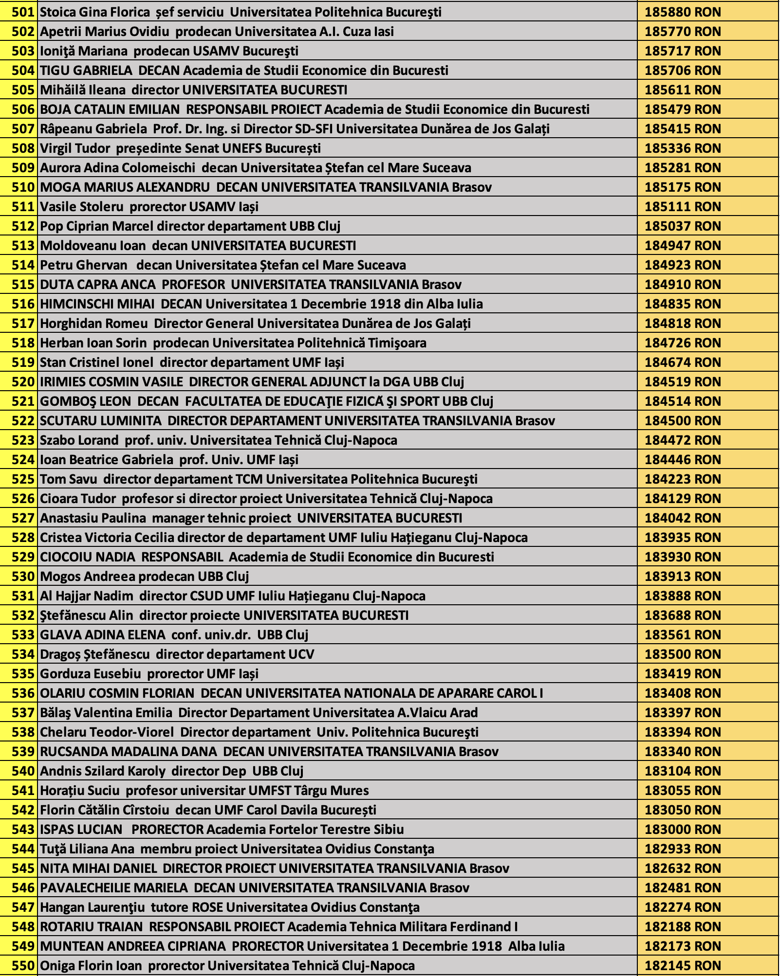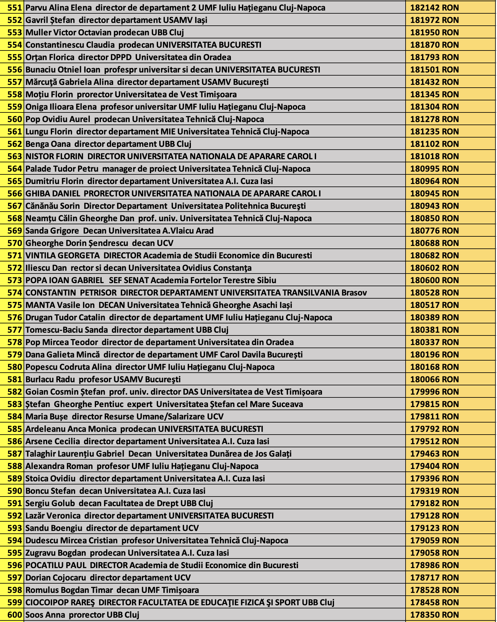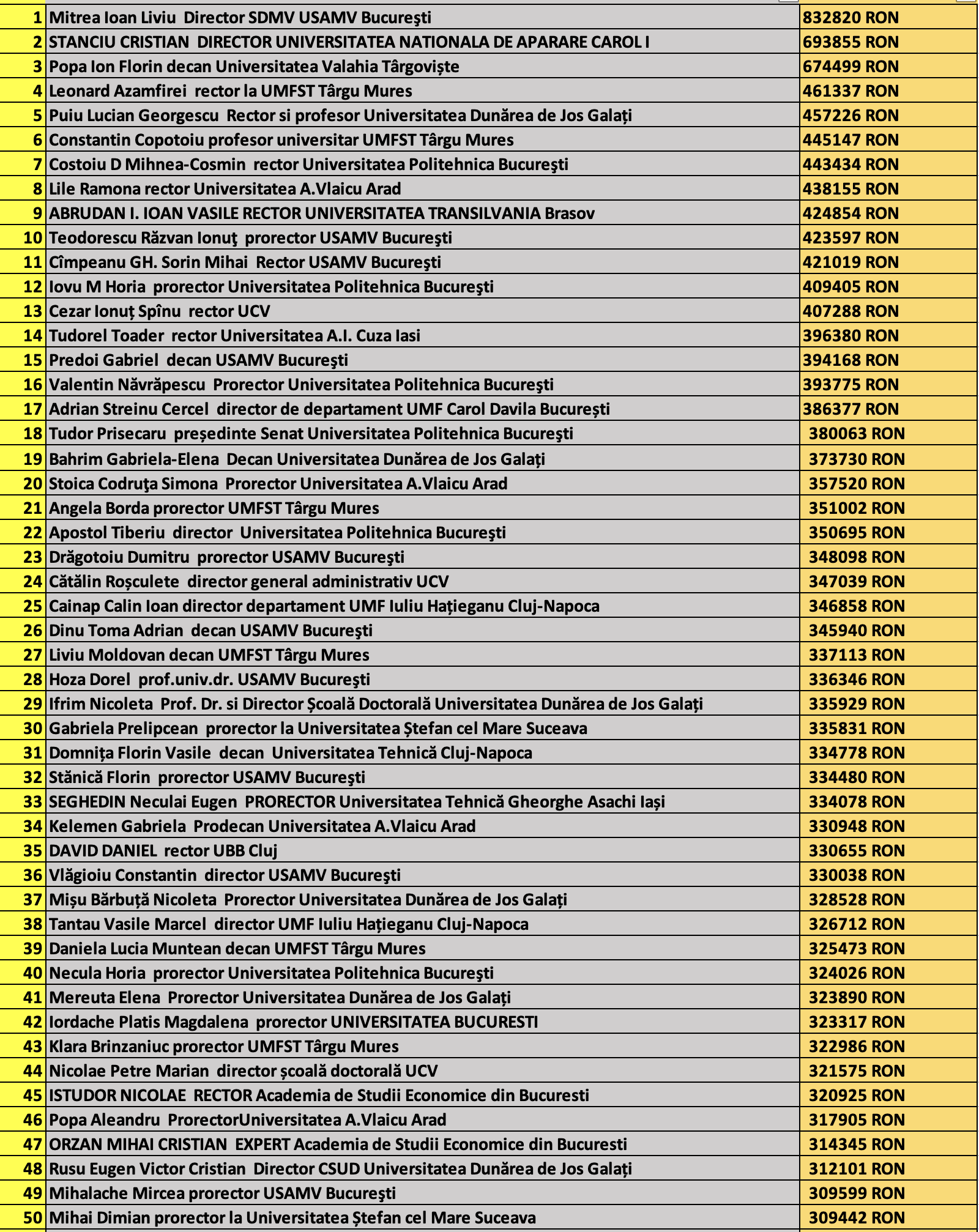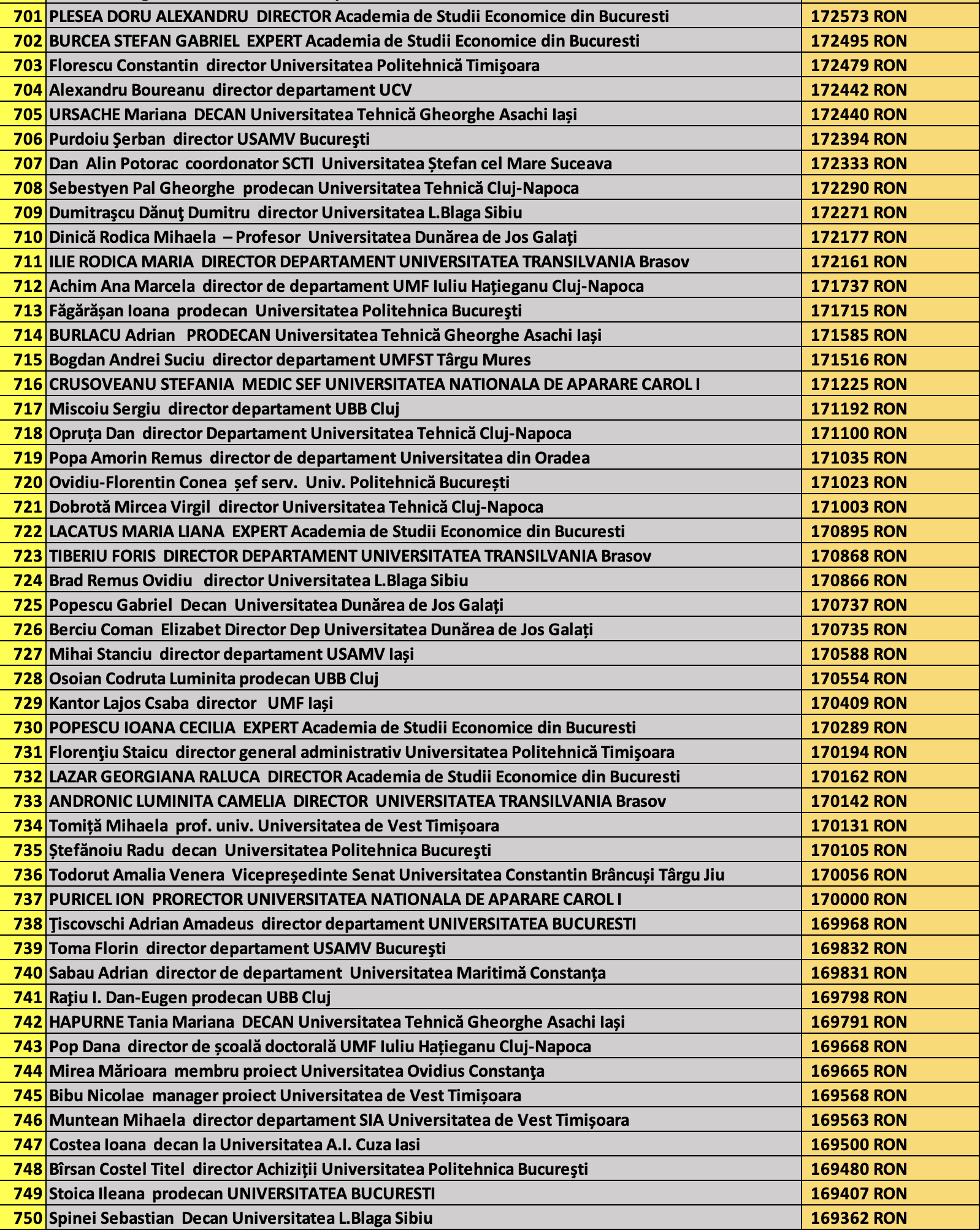 desi mai jos aveti 1100 de salarii super babane din mediul universitar de stat, sa nu uitati ca, de la locul 1100 in jos, cateva zeci de mii de atarnatori sug si ei salarii foarte bune, chiar daca mai mici decat ale bastanilor. Universitatile de stat romanesti sunt sinecuri extraordinare, unde munca e putina, salariile superbe si mereu e rost de spagi, daca te ocupi de achizitii sau de alte "intreprinderi" lucrative.