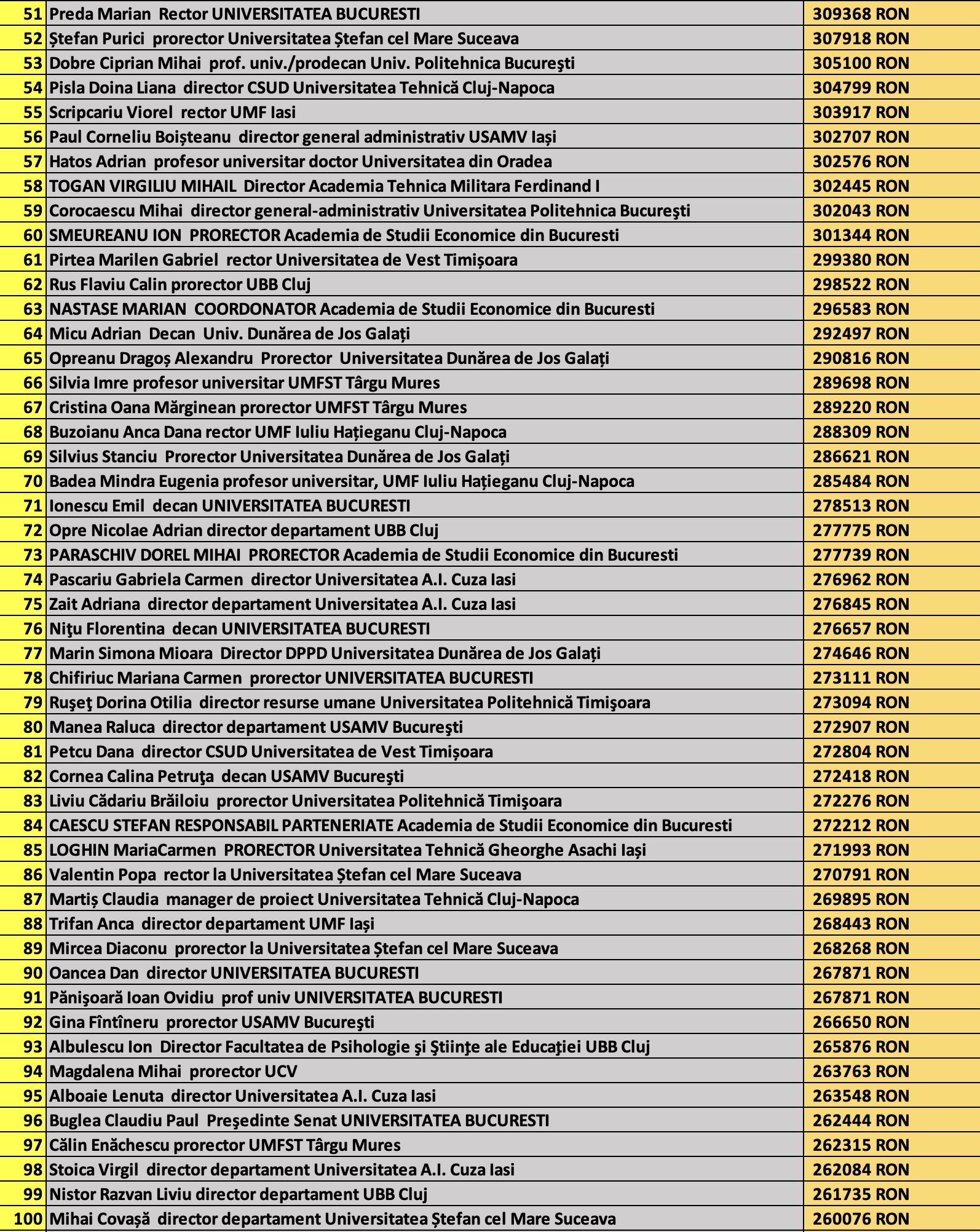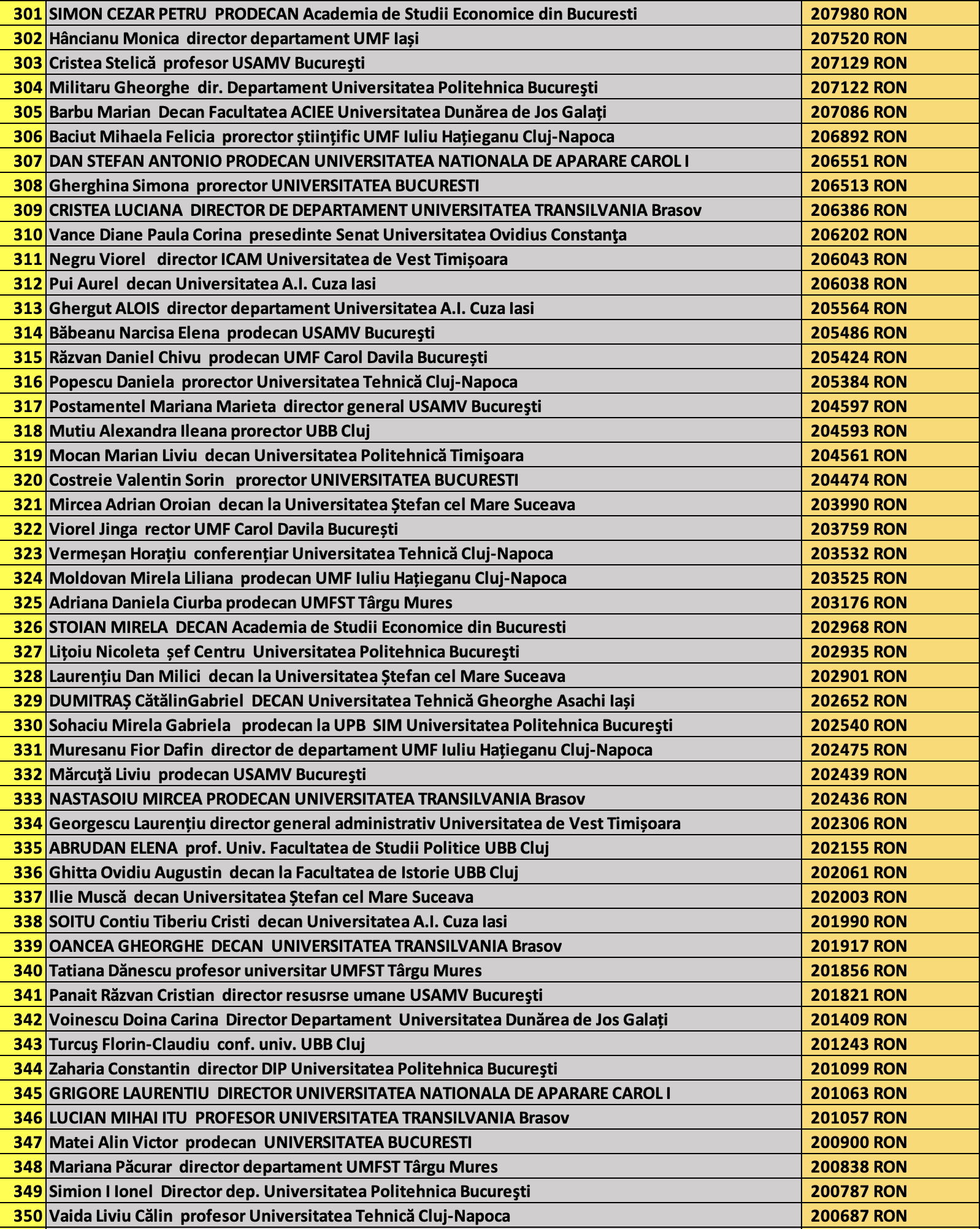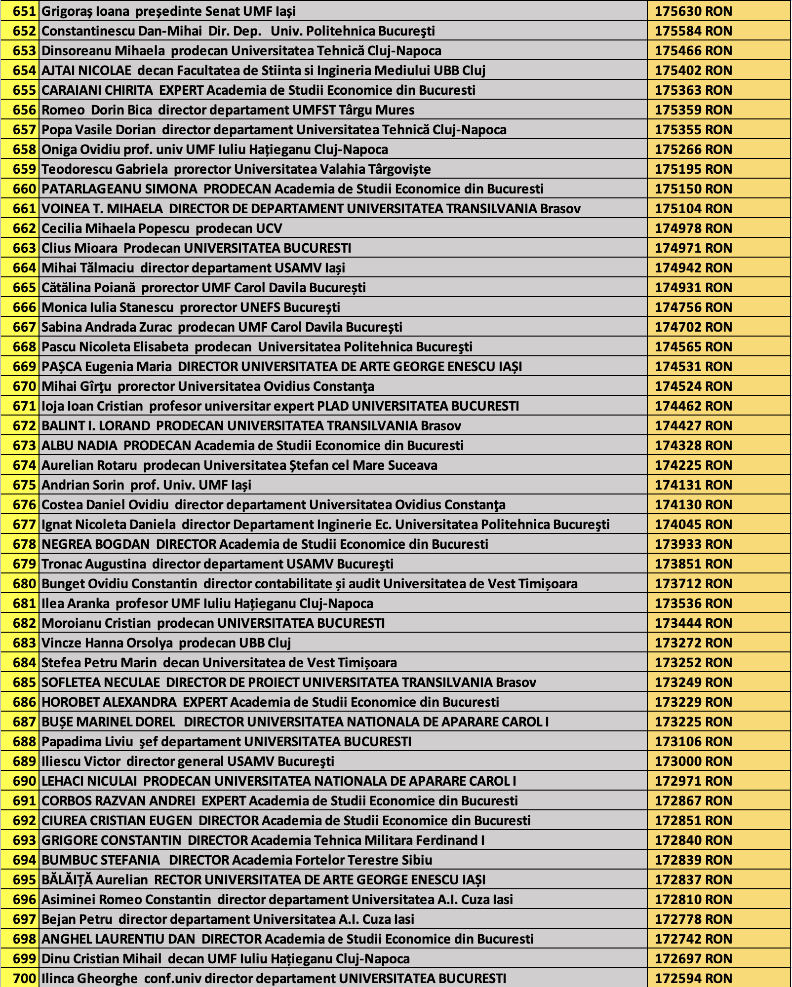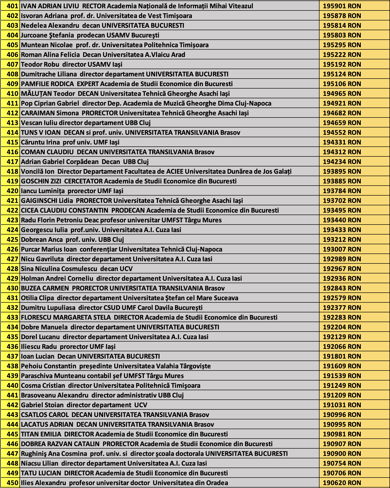 desi mai jos aveti 1100 de salarii super babane din mediul universitar de stat, sa nu uitati ca, de la locul 1100 in jos, cateva zeci de mii de atarnatori sug si ei salarii foarte bune, chiar daca mai mici decat ale bastanilor. Universitatile de stat romanesti sunt sinecuri extraordinare, unde munca e putina, salariile superbe si mereu e rost de spagi, daca te ocupi de achizitii sau de alte "intreprinderi" lucrative.