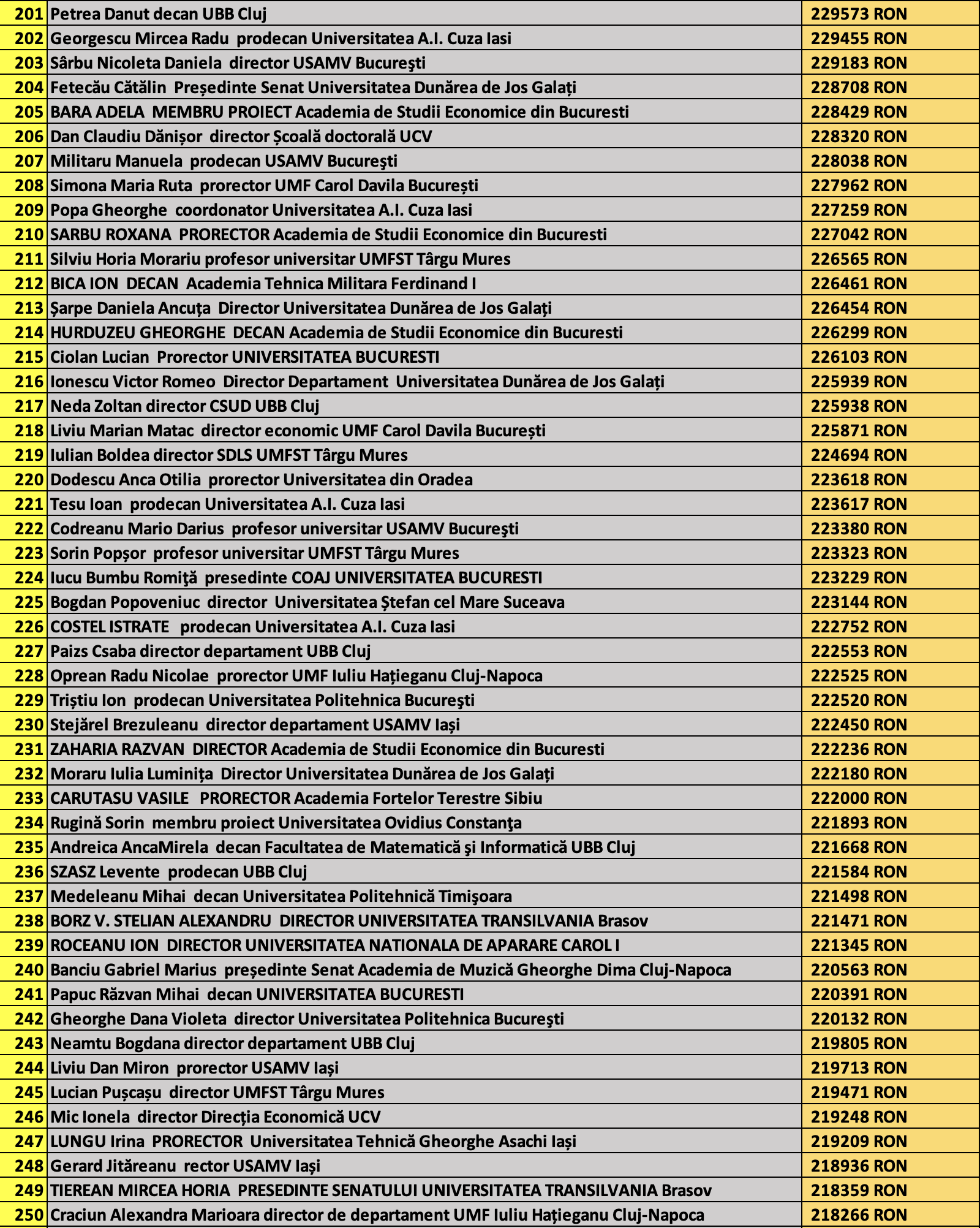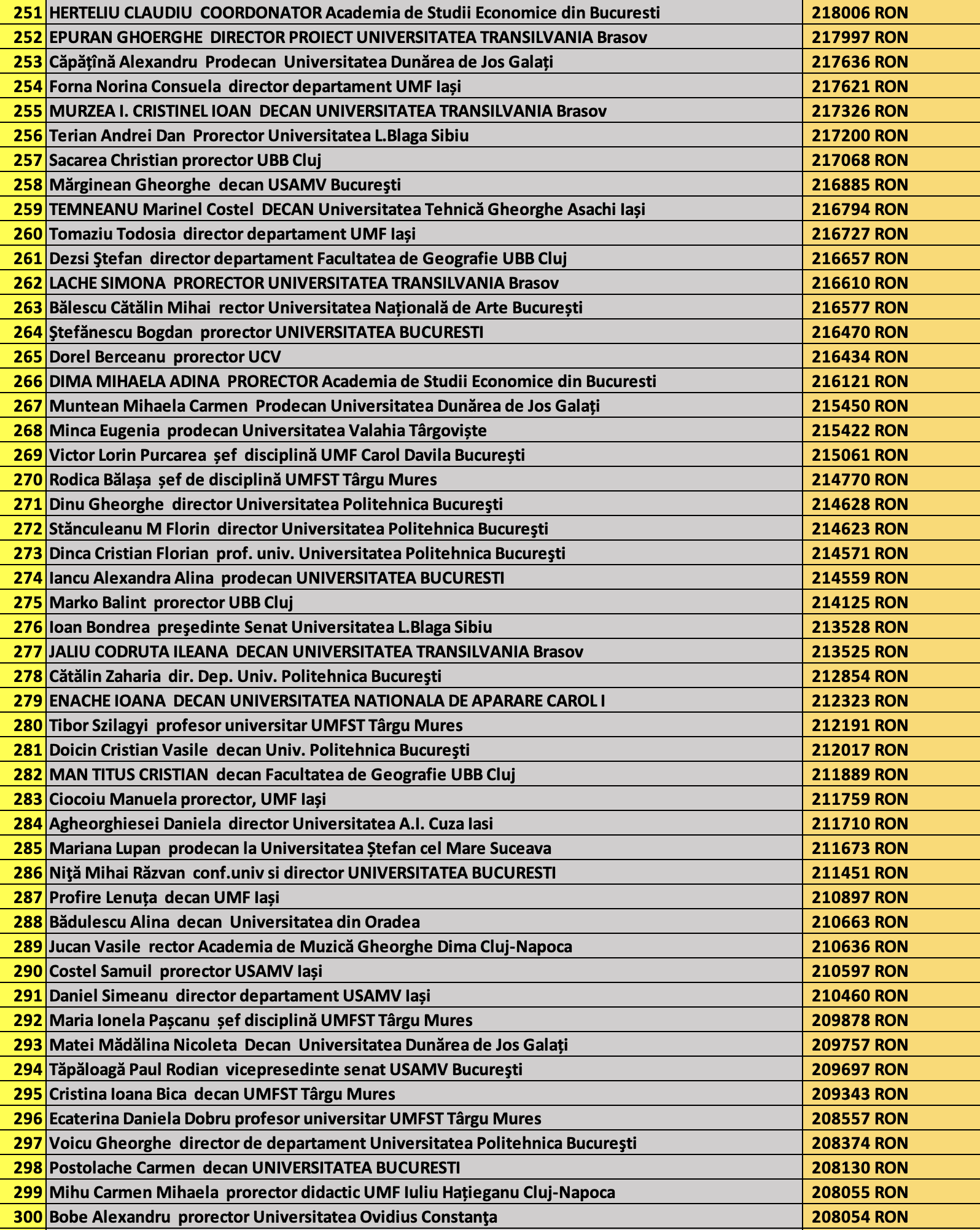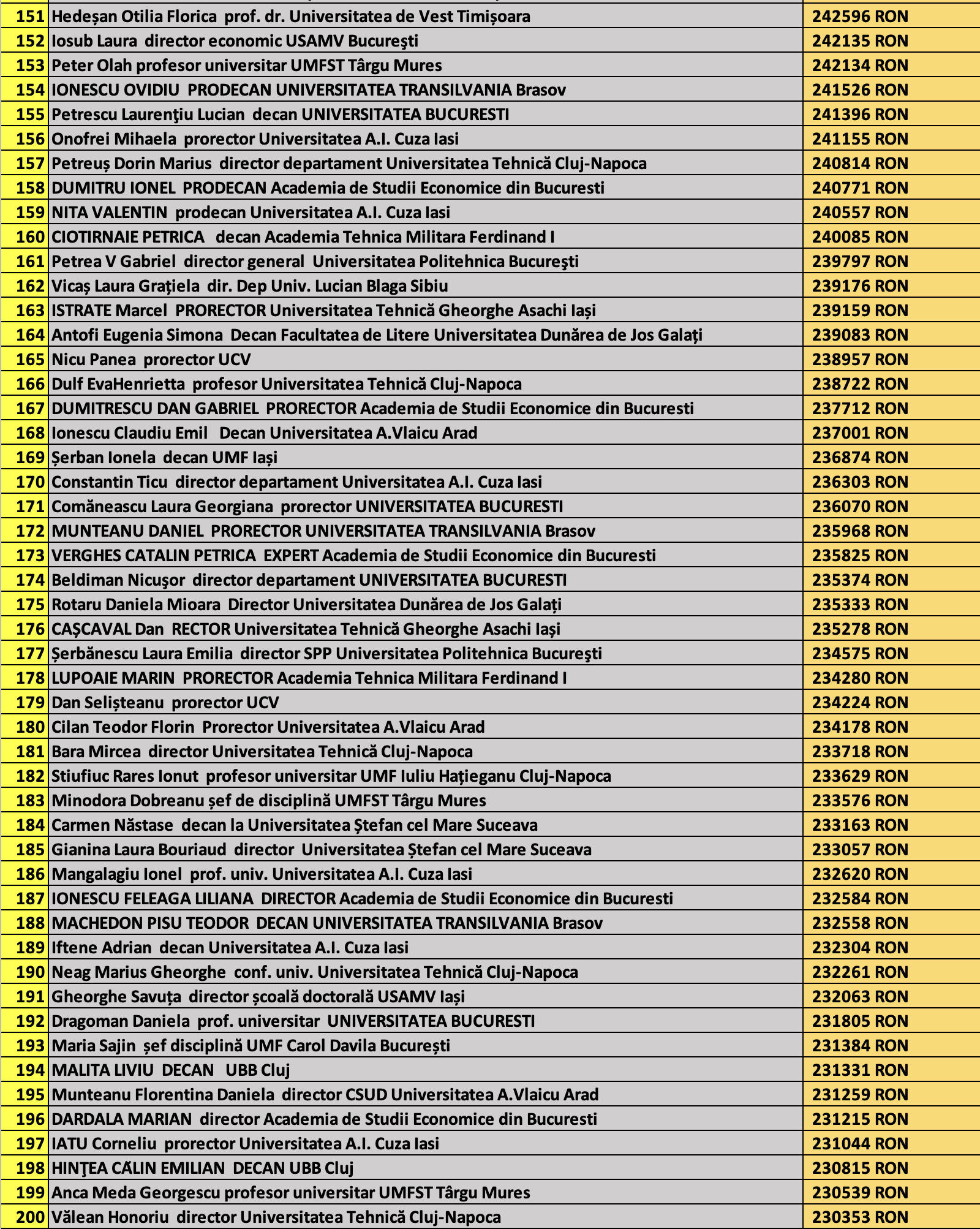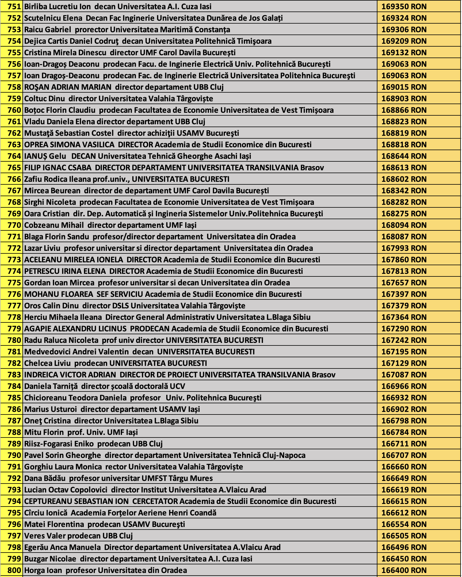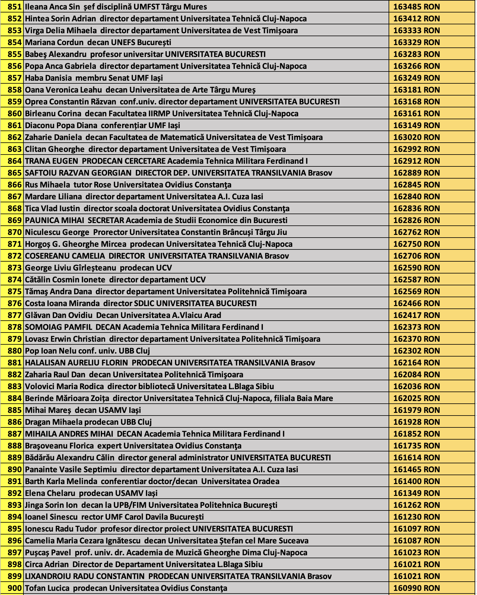 desi mai jos aveti 1100 de salarii super babane din mediul universitar de stat, sa nu uitati ca, de la locul 1100 in jos, cateva zeci de mii de atarnatori sug si ei salarii foarte bune, chiar daca mai mici decat ale bastanilor. Universitatile de stat romanesti sunt sinecuri extraordinare, unde munca e putina, salariile superbe si mereu e rost de spagi, daca te ocupi de achizitii sau de alte "intreprinderi" lucrative.