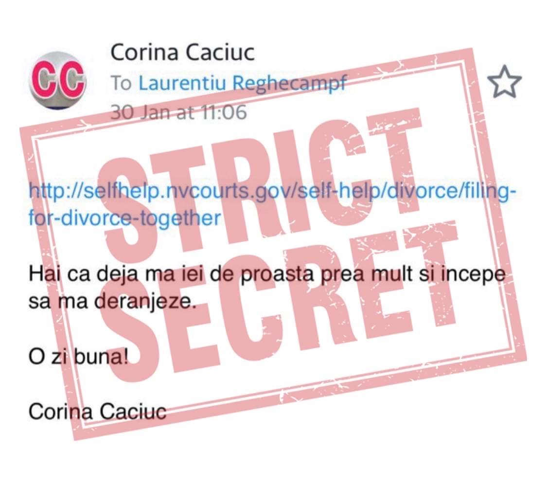 Cel mai probabil, așa cum îi scrie Caciuca lui Reghe pe 27 ianuarie, marele bărbat a mințit-o spunându-i că merge în State să tranșeze divorțul pe acte, când colo, el se culca cu Prodanca și se hăhăiau la Miami. Caciuca îi transmite indirect un gând bun Prodancăi, dacă nu era ea să se afișeze cu poze, nu ar fi aflat cât de rău s-a lăsat prostită.