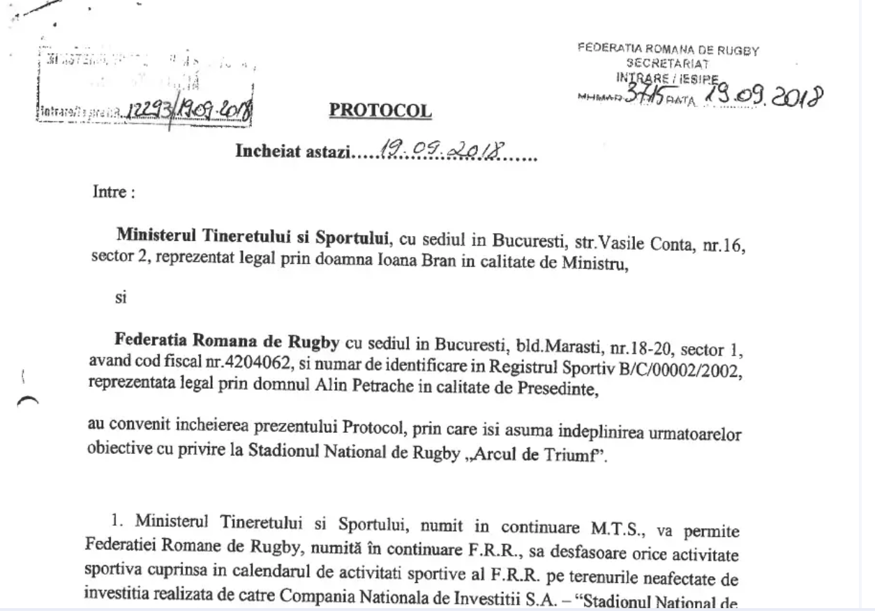 Un adevăr de partea FRR există și e incontestabil: la 19 septembrie 2018, Federația Română de Rugby și Ministerul Tineretului și Sportului încheiau un protocol conform căruia FRR se angaja să finanțeze din venituri proprii întocmirea documentației Planului Urbanistic Zonal pentru suprafețele de teren predate de MTS către Compania Națională de Investiții și să facă toate demersurile necesare tuturor avizelor și autorizațiilor necesare, inclusiv a Autorizației de Construire.