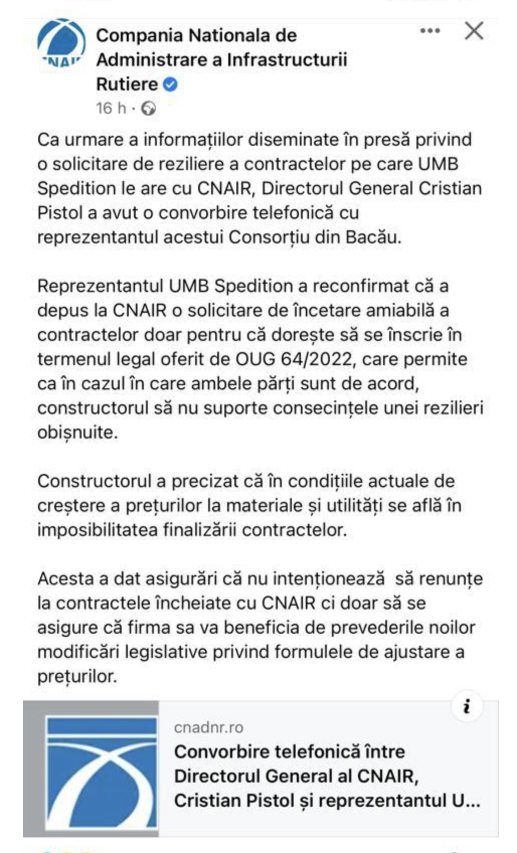 Dar astăzi, CNAIR este o cloacă de interese, de incompetență și de istericale de prost gust. Dezvăluirea noastră de ieri, în care arătam cum șantajează Dorinel Umbrărescu, cel mai mare constructor român, instituția CNAIR pentru a obține bani mai mulți pentru terminarea lucrărilor de autostrăzi în care este implicat, i-a enervat pe toți protagoniștii de la ministrul Transporturilor Sorin Grindeanu, până la Cristian Pistol - șeful CNAIR și chiar [e Dorinel Umbrărescu, milionarul băcăuan care conduce UMB Spedition.