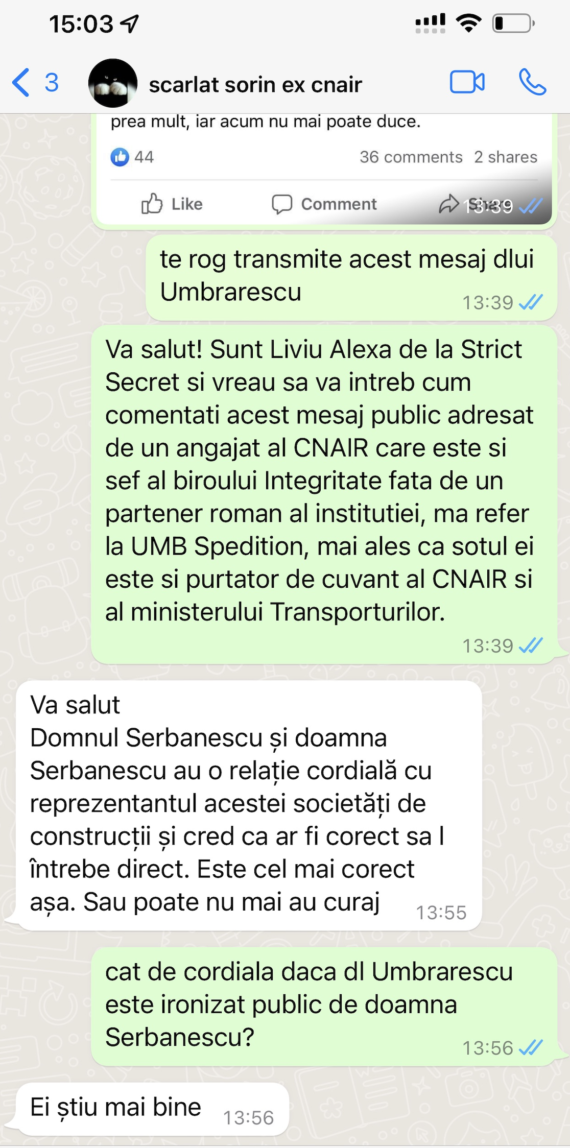 Așadar, pe de-o parte, soțul Alin Șerbănescu, purtător de cuvânt al Ministerului Transporturilor, îl linge în fund pe Umbrărescu, pe de altă parte nevasta Valentina Șerbănescu, ditamai angajat al CNAIR, șef de Birou Control-Integritate în CNAIR, își bate joc de constructorul român căruia CNAIR i-a dat cele mai multe contracte de autostradă.