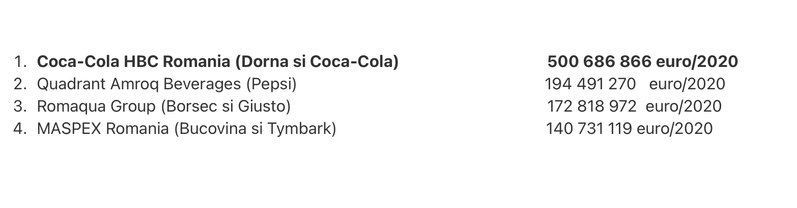 În acest top, Coca Cola e locul 1, urmată de Pepsi, pe 3 vine Romaqua Group, onorabil de altfel și cu atât mai important pentru că sunt singurii români din top, iar pe 4 vine Maspex: