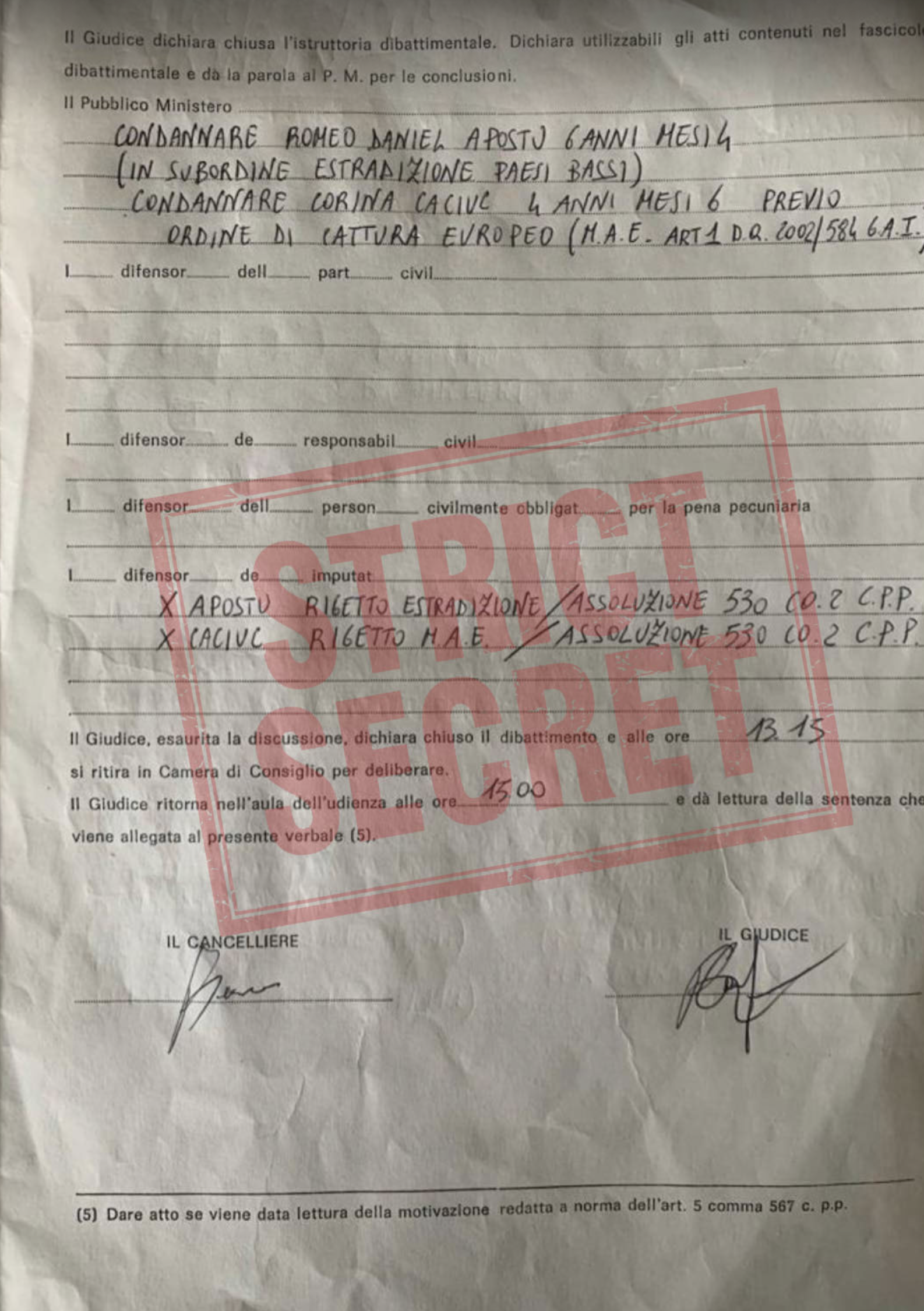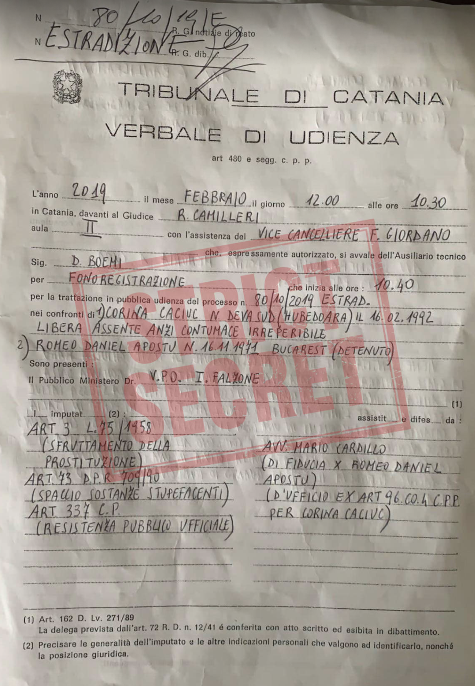 De cealaltă parte, lucrurile sunt și mai penibile. Reghecampf este într-o campanie furibundă de achiziție a tuturor videourilor compromițătoare ce o au drept protagonistă pe Corina Caciuc, mama copilului său. Și sunt o tonă de pornoșaguri cu Caciuca făcând o grămadă de lucruri pe la chefurile unde e ra chemată să se prostitueze.Mai există o categorie de filme hard porno cu Caciuca, dar ele nu vor apărea niciodată, căci sunt făcute de politicieni, sportivi, toți căsătoriți, și care au "curentat-o" din toate pozițiile, dar nu se pot expune.Reghecampf e captiv în șantajul țesut chir cu ajutorul său de Caciuca. Corina Caciuc îl șantajează pe Reghecampf cu propriile filmulețe, acum și cu perspectiva copilului, deci circul e complet.Strict Secret este singura publicație din România care a făcut dezvăluiri consistente despre Corina Caciuc, dovedind că este o prostituată de joasă speță ce vrea să se respectabilizeze lipindu-se de imaginea și portofelul lui Reghecampf, "gâscă" pe care a vânat-o ani de zile. Căci asta e visul oricărei prostituate de tipul Caciucăi, să prindă un papagal cu bani și să îi trântească un copil, iar apoi să ducă o viață de împărăteasă fără să mai fie nevoie să o "ia" prin cluburi și bordeluri.Asta nu poate șterge Reghecampf, oricât s-ar strădui. Că s-a combinat cu o prostituată pe care au "găurit-o" toți în București, Dubai, pe yacht-uri, în bordelurile din Germania, Italia sau Franța.Astăzi o să închidem din nou masa, cum se spune, cu o dezvăluire de netăgăduit. Un document rar, o minută a unei dezbateri, un proces verbal de audiere ce a avut loc în februarie 2019 la Tribunalul din Catania în prezența judecătorului Roberto Camilleri (foto jos). În dosarul de extrădare nr. 80/10/2019, procurorii italieni i-au cerut lui Camilleri condamnarea Corinei Caciuc pentru prostituție, la acel moment judecată în lipsă, căci nu se găsea pe teritoriul Italiei, și a lui Romeo Daniel Apostu, deținut la momentul judecății, pentru proxenetism.