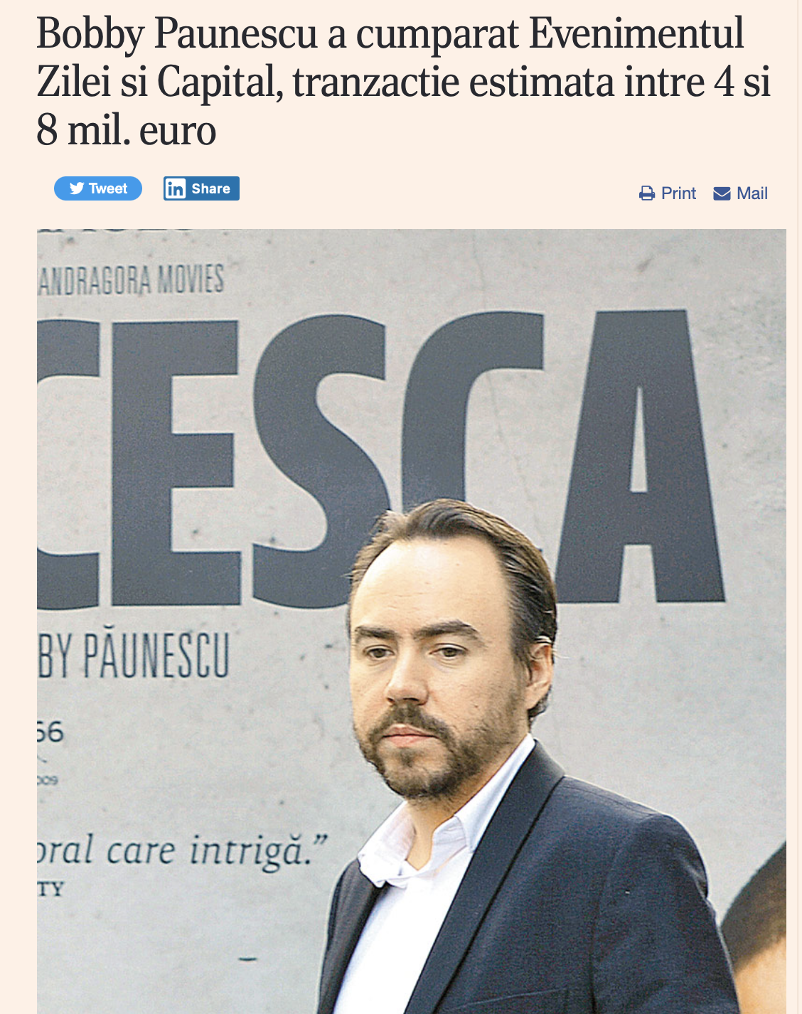 În februarie 2010, Evenimentul Zilei și Capital, unele dintre cele mai cunoscute branduri din presa românească care erau parte din trustului Ringier au fost cumpărate de omul de afaceri Bobby Păunescu (foto), fiul cel mai mic al unuia din cei mai puternici oameni de afaceri de acum 15 ani, George Constantin Păunescu. La acea vreme, Bobby Păunescu controla B1 TV, VOX News și ziarul local Gazeta de Sud.
