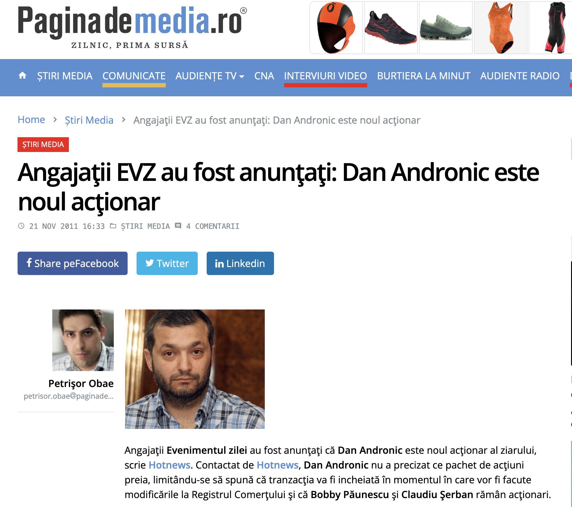 Aproape doi ani mai târziu, Bobby Păunescu vindea, cel puțin oficial, 90 la sută din acțiuni lui Dan Andronic, jurnalist și consultant politic.