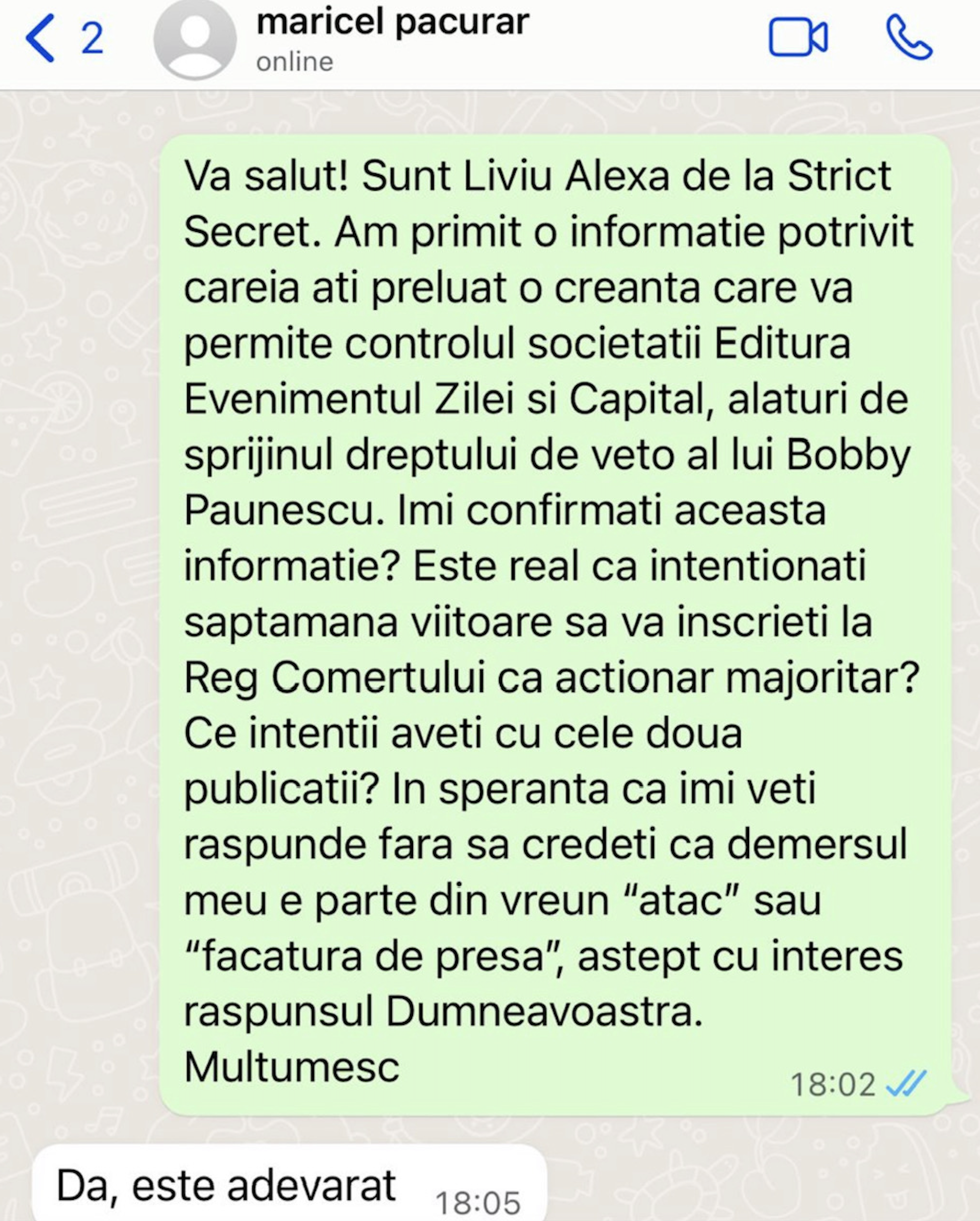 Una peste alta însă, lucrurile s-au întâmplat exact așa cum vă spunem. Maricel Păcurar s-a și lăudat printre apropiați că săptămâna viitoare va depune înscrisurile doveditoare la Registrul Comerțului București și că va deveni noul patron al publicațiilor Evenimentul Zilei și Capital.