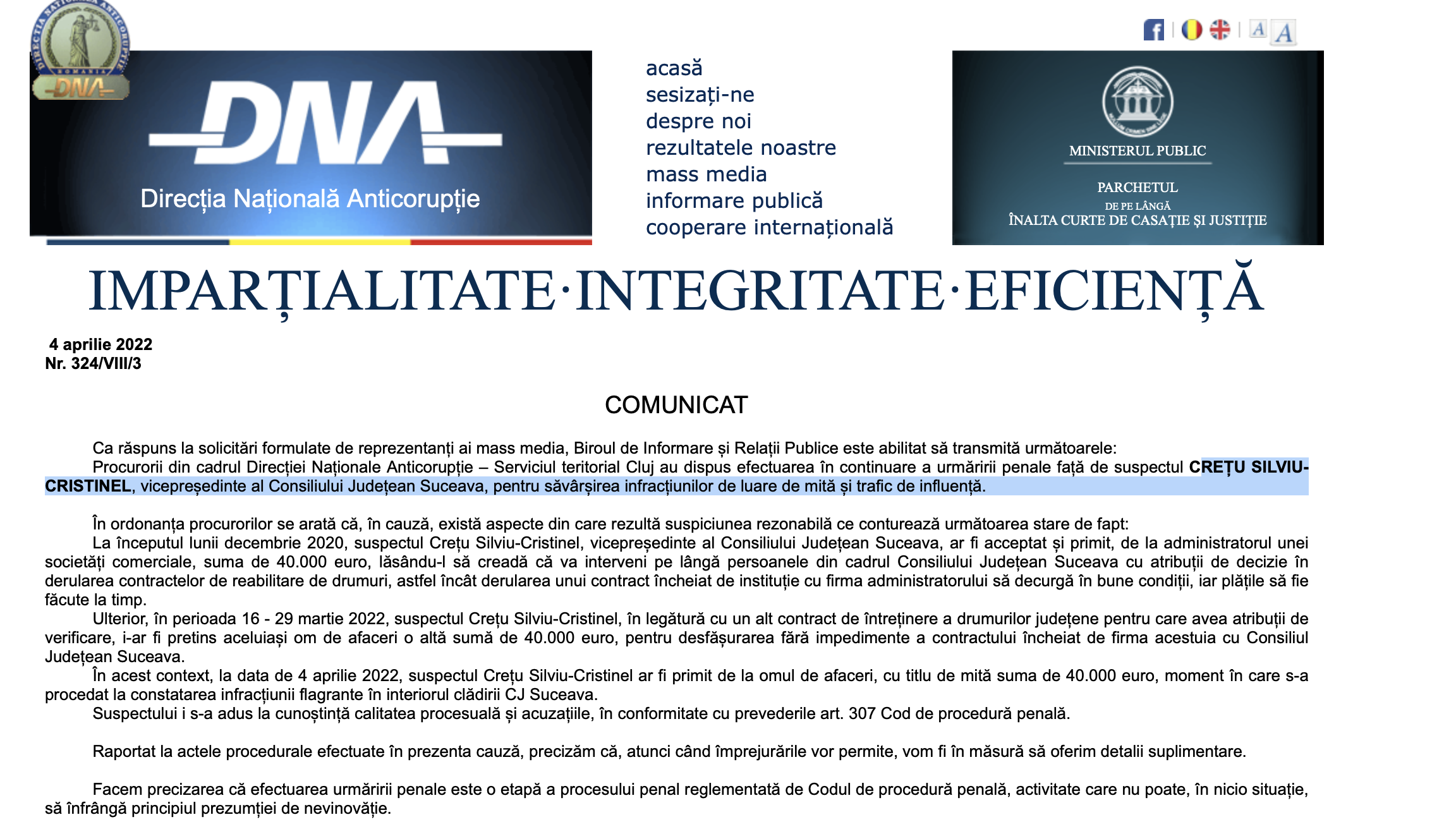 Șoc în această dimineață, când în jurul orei 10:20, procurorii DNA Cluj, împreună cu polițiștii judiciari, au descins în biroul vicepreședintelui CJ Suceava, Silviu Cristinel Crețu, mâna murdară-dreaptă a baronului Gheorghe Flutur, unde au găsit un plic cu 40.000 de euro, reprezentând mită dată de omul de afaceri Vasile Rîpan, cunoscut drumar în zonă și câștigătorul unor proiecte importante de realizare a infrastructurii.