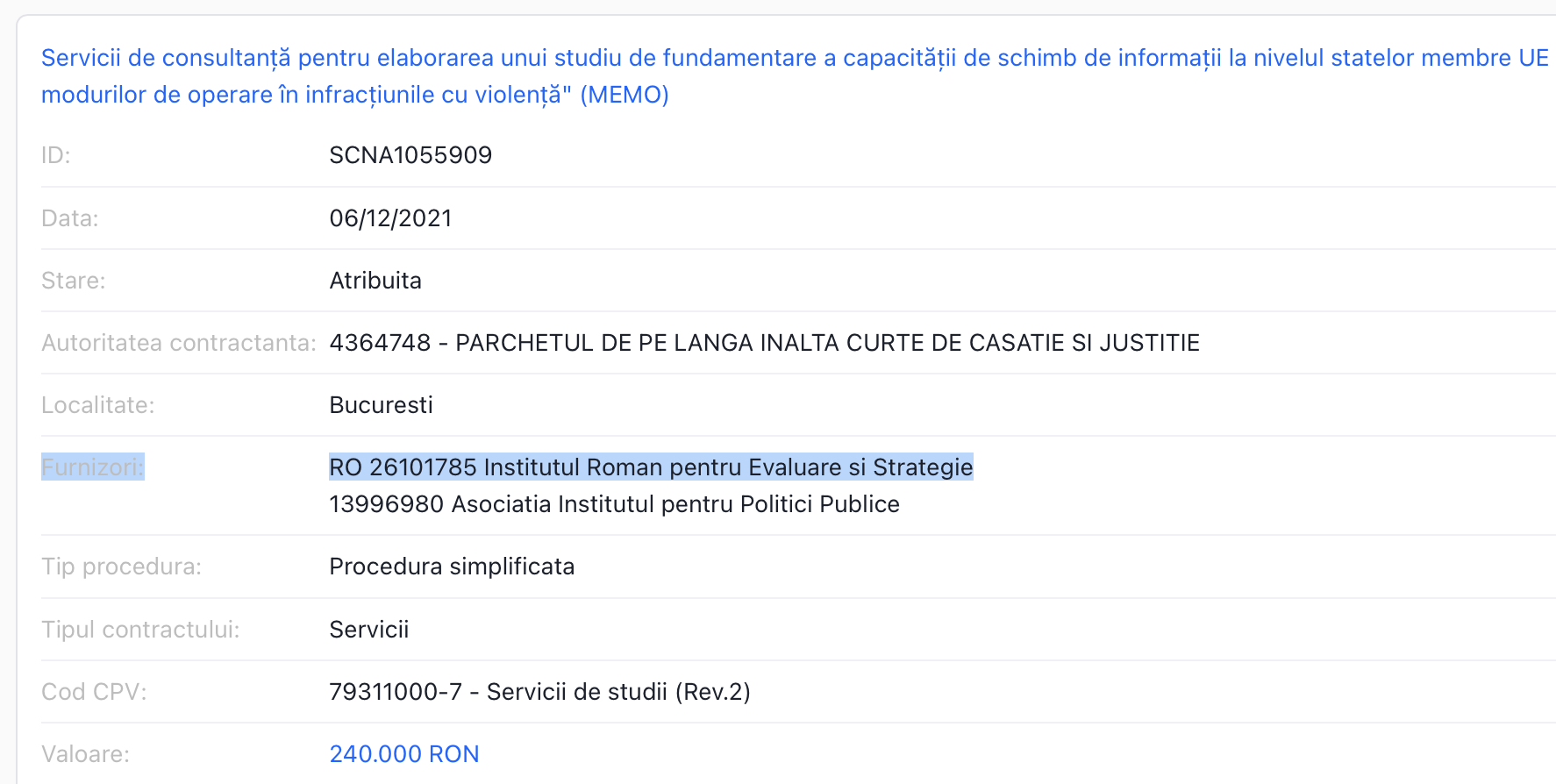 Parchetul de pe lângă Înalta Curte de Casație și Justiție a atribuit ieri Institutului Român pentru Evaluare și Strategie (IRES), în spatele căruia se află Vasile Dâncu, actualmente ministrul Apărării, un contract în valoare de 240 000 de lei pentru "Servicii de consultanță pentru elaborarea unui studiu de fundamentare a capacității de schimb de informații la nivelul statelor membre UE asupra modurilor de operare în cazurile de infracțiuni de mare violență în cadrul proiectului ISFP-2017-AG-FORENSIC-821555 "Schimburi de informaţii în materia modurilor de operare în infracţiunile cu violenţă" (MEMO)".