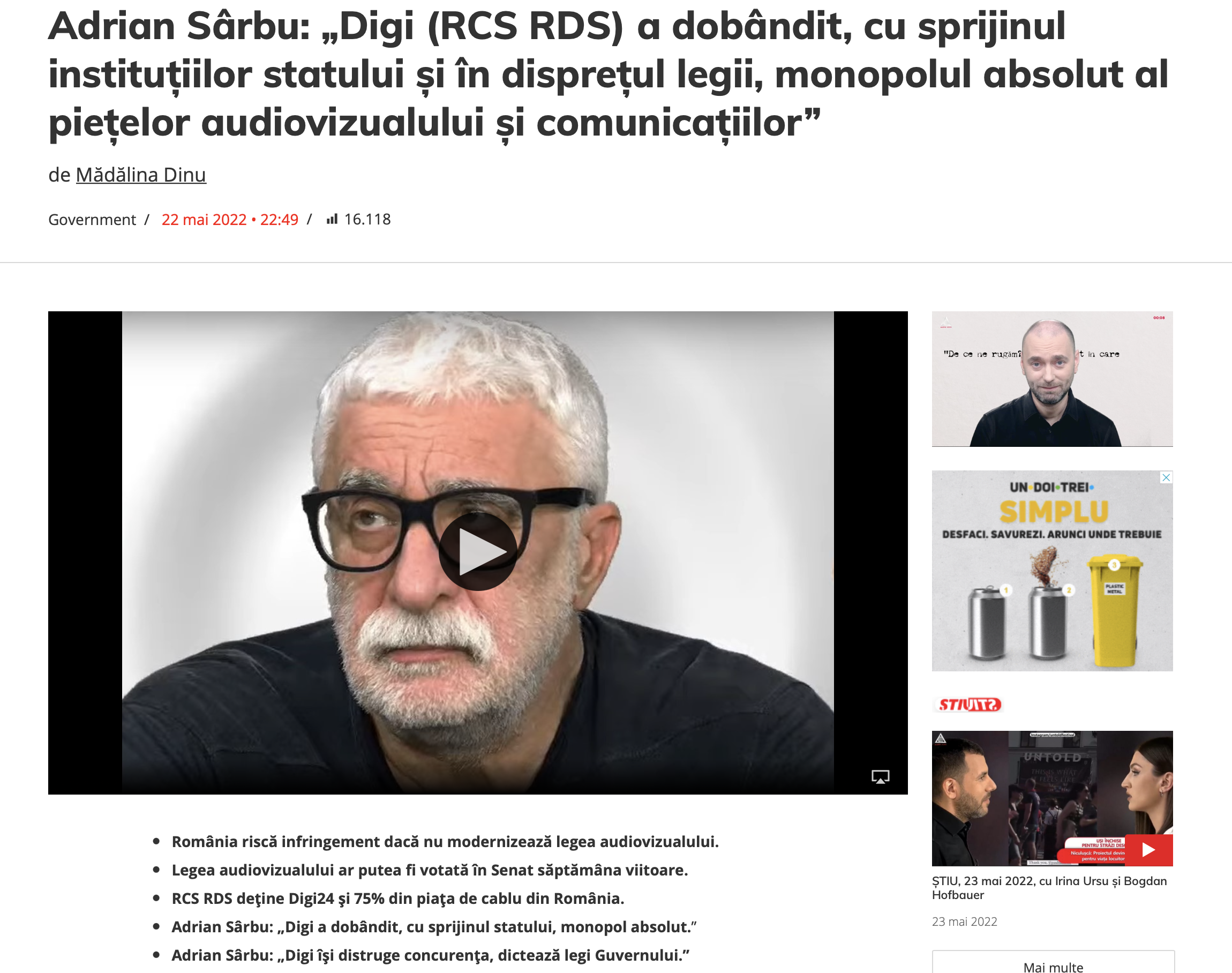 Adrian Sîrbu s-a referit în alocuțiunea sa doar la mărimea procentajului de control al pieței de cablu pe care DIGI o controlează, peste 75%, menționând în treacăt și faptul că RDS-RCS este și proprietarul trustului media DIGI cu a sa televiziune, al său site și al său radio. Nu, din păcate, nu e doar atât.