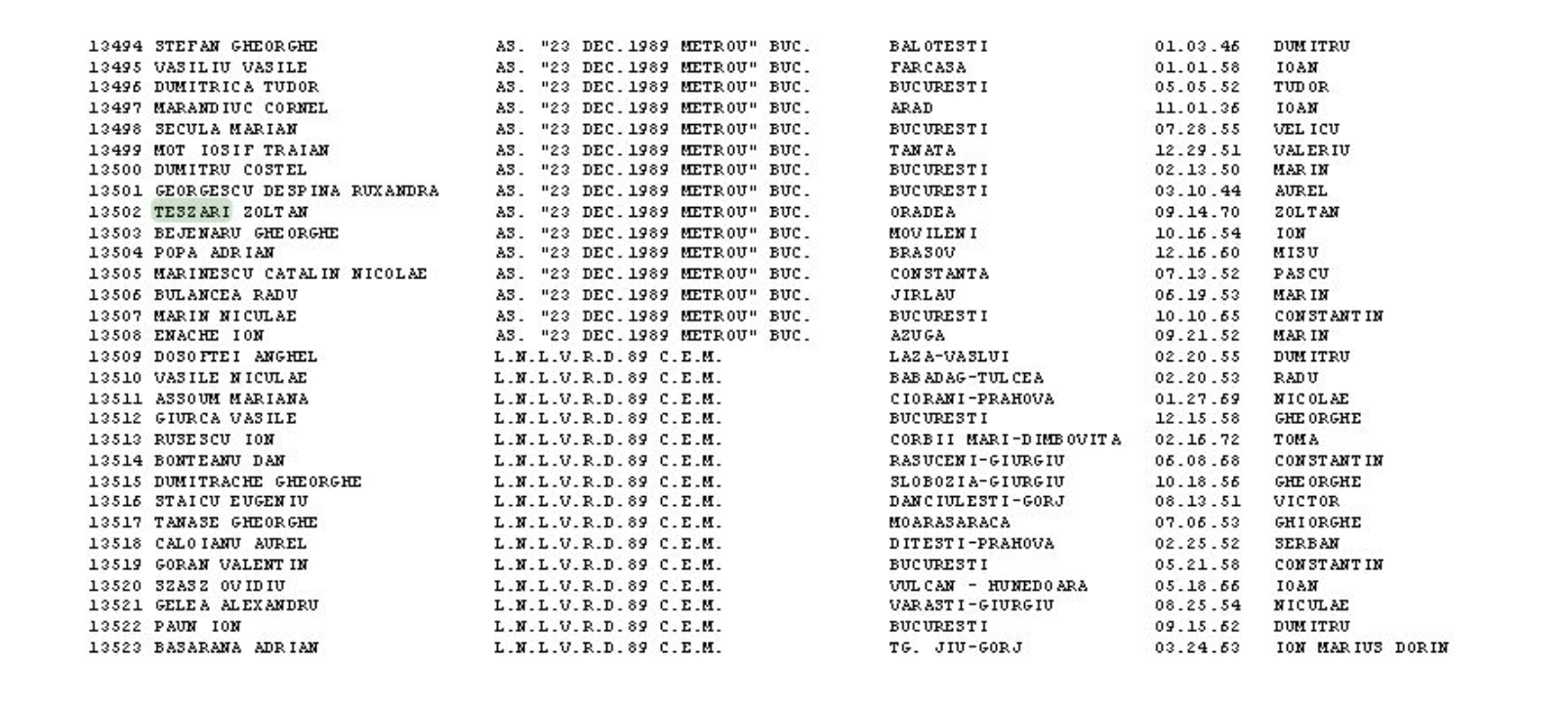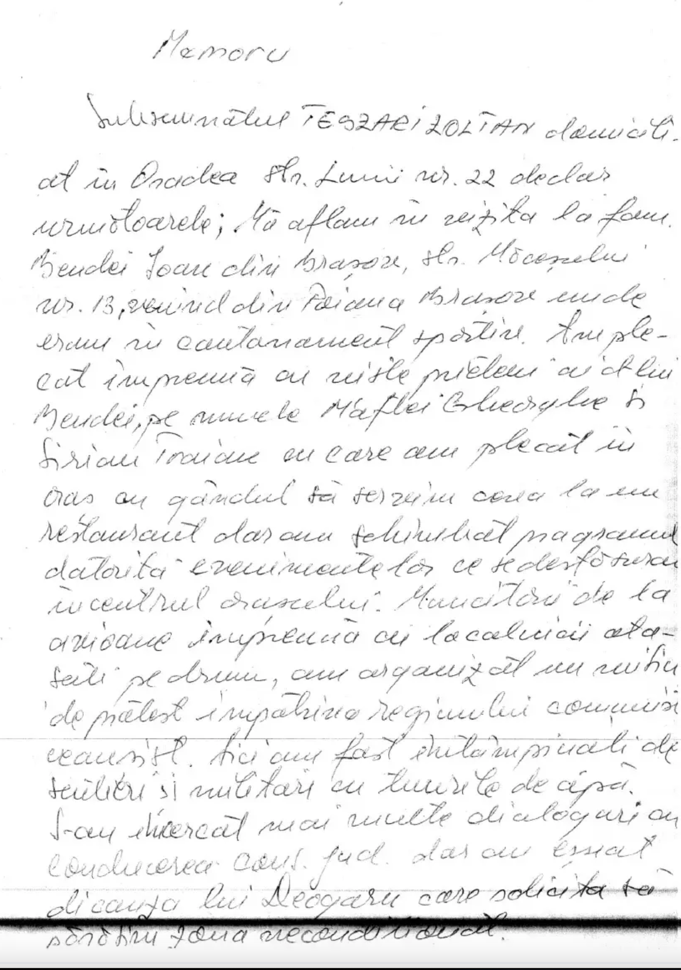 "Subsemnatul Teszari Zoltan, domiciliat in Oradea (...) declar urmatoarele: Ma aflam in vizita la fam. Bendei Ioan din Brasov, str. (...), venind din Poiana Brasov unde eram in cantonament sportiv. Am plecat impreuna cu niste prieteni ai d-lui Bendei, pe numele Maftei Gheorghe si Sirianu Traian cu care am plecat in oras cu gandul sa servim ceva la un restaurant dar am schimbat programul datorita evenimentelor ce se desfasurau in centrul orasului. Muncitorii de la avioane impreuna cu localnicii atasati pe drum, am organizat organizat un miting de protest impotriva regimului comunist ceausist. Aici am fost intampinati de scutieri si militari cu tunuri de apa. S-au incercat mai multe dialoguri cu conducederea cons. jud. (n.r. - Consiliul Judetean Brasov) dar au esuat din cauza lui Deogaru care solicita sa parasim zona neconditionat. Din cei care au fost in zona recunosc pe Dinu Costica, Samson Nicolae, Giutu Lucian, Sandu Ion, Bata Adrian si altii. In jurul orei 21:00 se pleaca in grupuri spre intreprinderi pentru informarea acestora si scoaterea sa participe la declansarea grevei generale. In dimineata zilei de 22 Dec. 89 in sediu a intrat grupul de petitionari cu o petitie in care cereau principalele revendicari, iar in timpul discursurilor se anunta pe mass-media fuga lui Ceausescu, dupa care este invadat de catre participanti sediul cons. jud. iar in sala de sedinta se constitutie prima cond. provizorie cu pres. Gen.Florea iar cei prezenti numiti la sugestia lui Vilianu Sergiu, consilieri. Se elibereaza legitimatii de catre Carausu Victor. Mr. Vasiliu solicita oameni pentru o grupa de verificare exterioara a sediului cat si imprejurimile unde se aflau obiective strategice. In data de 24 Dec. 89 dupa moartea lui M.M. Fantcuia si Pauinea si a lui Bata Adrian care ii reprosa Gen. Florea modul dictatorial de conducere, dupa care foarte multi civili au fost escortati din sediul cons. jud. sub pretext ca sau infiltrat teroristi printre ei. Pentru cele relatate de mine se pot consulta registrul din cons. jud. cat si casetele video din acea perioada si personal pentru complectarea de amanunte."
