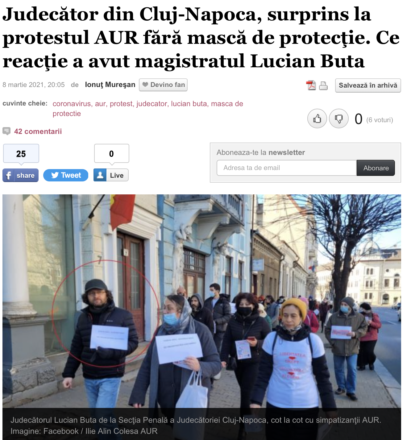 Noi, presa ”nesimțită și obraznică” suntem cei care v-am arătat cât de ipocrit este casta judecătorilor. Nimeni n-a zis nimic când judecătorul Lucian Buta a fost pozat fără mască, încâlcând măsurile din pandemie și n-a zis nimeni când Buta s-a afișat la protestul politic al extremiștilor de la AUR.