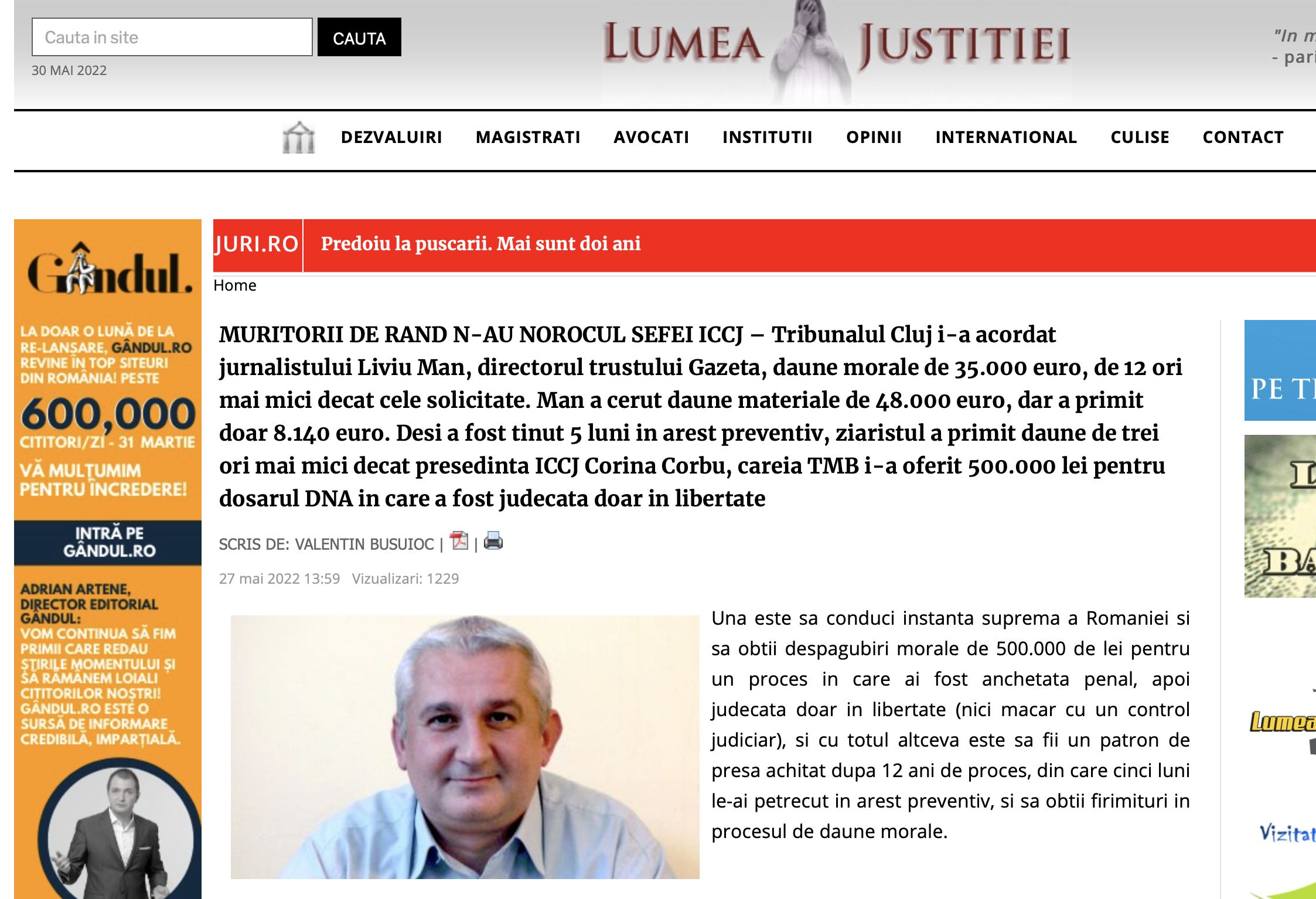 Deși primise la o instanță inferioară o sumă decentă pentru suferințele, umilința și viața sa distrusă definitiv, adică undeva la 230 mii euro, Aurel Mureșan a fost călcat în picioare de judecătoarele de la Curtea de Apel Cluj care i-au tăiat cu de nouă ori suma cuvenită. Rușinos, scandalos, jegos! Câteva zile mai târziu, prietenul meu Liviu Man, ținta adevărată din cazul Gazeta, a fost umilit și el, de data aceasta la Tribunalul Cluj care au priceput mesajul trimis de la Curtea de Apel Cluj și au dat lui Liviu Man o sumă jeantă pentru viața sa distrusă. Care a fost vina lui Aurel Mureșan și pentru ce a fost umilit și Liviu Man? Pentru faptul că în Gazeta de Cluj au existat poziții critice la adresa procurorului șef al DNA Cluj, Ionuț Vasile. Soția lui Ionuț Vasile, ca judecător, nu s-a putut răzbuna direct pe man, dar i-a tras-o colegului Aurel Mureșan.