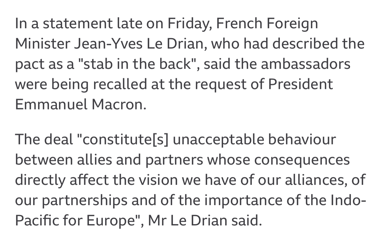 La nivel global, Franța și-a luat-o urât de tot în freză când, acum două zile, SUA și Australia au anunțat un pact de securitate surprinzător, care a forțat Australia să renunțe, la îndemnul Americii, la un uriaș contract pentru submarine în valoare de zeci de miliarde de euro, care era dedicat firmei franceze Naval Group.