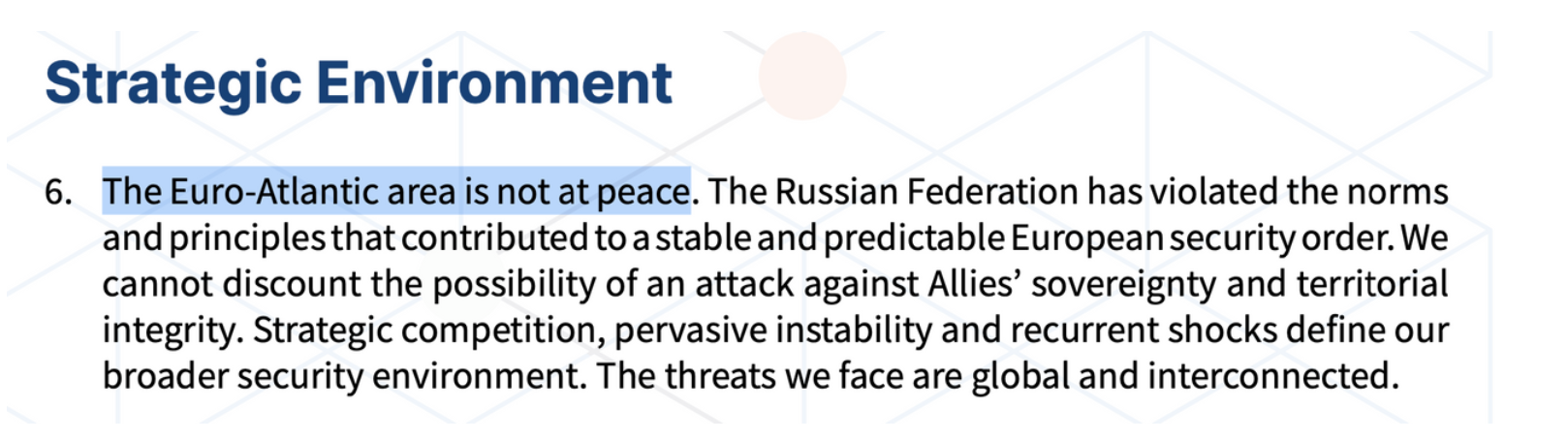 Într-o schimbare radicală față de ultimul document de strategie, publicat pentru prima dată în 2010 la Lisabona, noul document de strategie NATO proclamă că „zona euro-atlantică nu este calmă” ("to be at peace" are acest sens, deși substantivul "pace" poate să îi ofere altă nuanță), asta în ciuda faptului că niciunul dintre membrii alianței NATO nu a declarat vreun război în „zona euro-atlantică”.