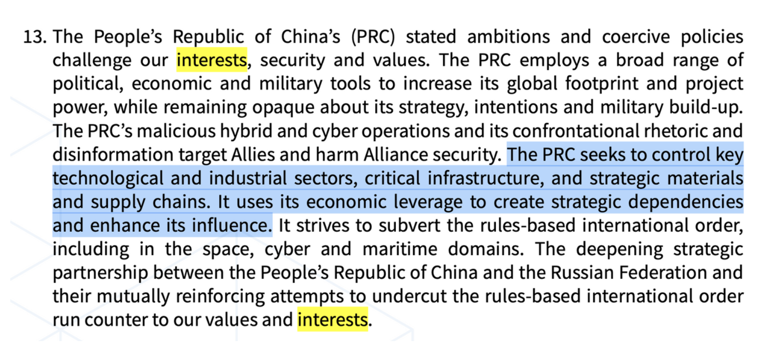 În timp ce documentul din 2010 a numit Rusia „partener”, cadrul strategic din acest an proclamă Rusia o „amenințare”, iar China o „provocare”. Noul document de strategie NATO justifică în mod explicit aceste desemnări declarând că aceste țări „contestă interesele noastre”, ba chiar se declară că „RPC [Republica Populară Chineză] încearcă să controleze sectoarele tehnologice și industriale cheie, infrastructura critică și materialele strategice și lanțurile de aprovizionare. Își folosește pârghia economică pentru a crea dependențe strategice și pentru a-și spori influența.”