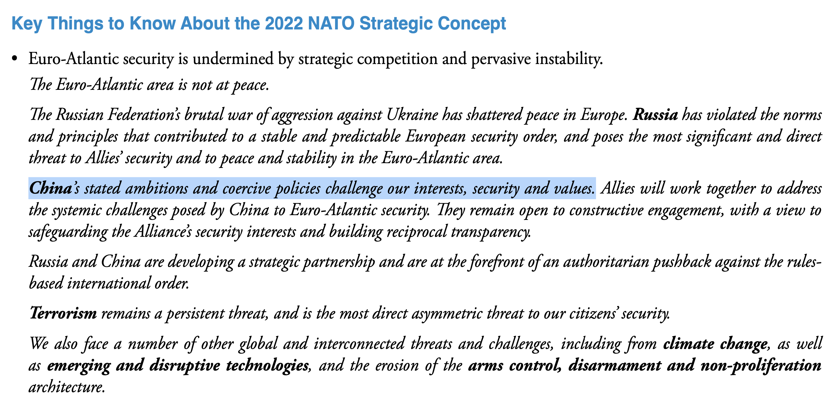 Ambițiile declarate și politicile coercitive ale Chinei ne provoacă interesele, securitatea și valorile. Aliații vor lucra împreună pentru a aborda provocările sistemice puse de China pentru securitatea euro-atlantică. Aceștia rămân deschiși angajamentului constructiv, în vederea protejării intereselor de securitate ale Alianței și a construirii transparenței reciproce.