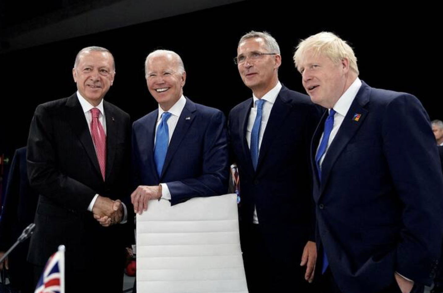 Președintele Turciei, Recep Tayyip Erdogan, președintele american Joe Biden, secretarul general NATO, Jens Stoltenberg și premierul britanic Boris Johnson la summitul NATO de la Madrid, Spania, 29 iunie 2022