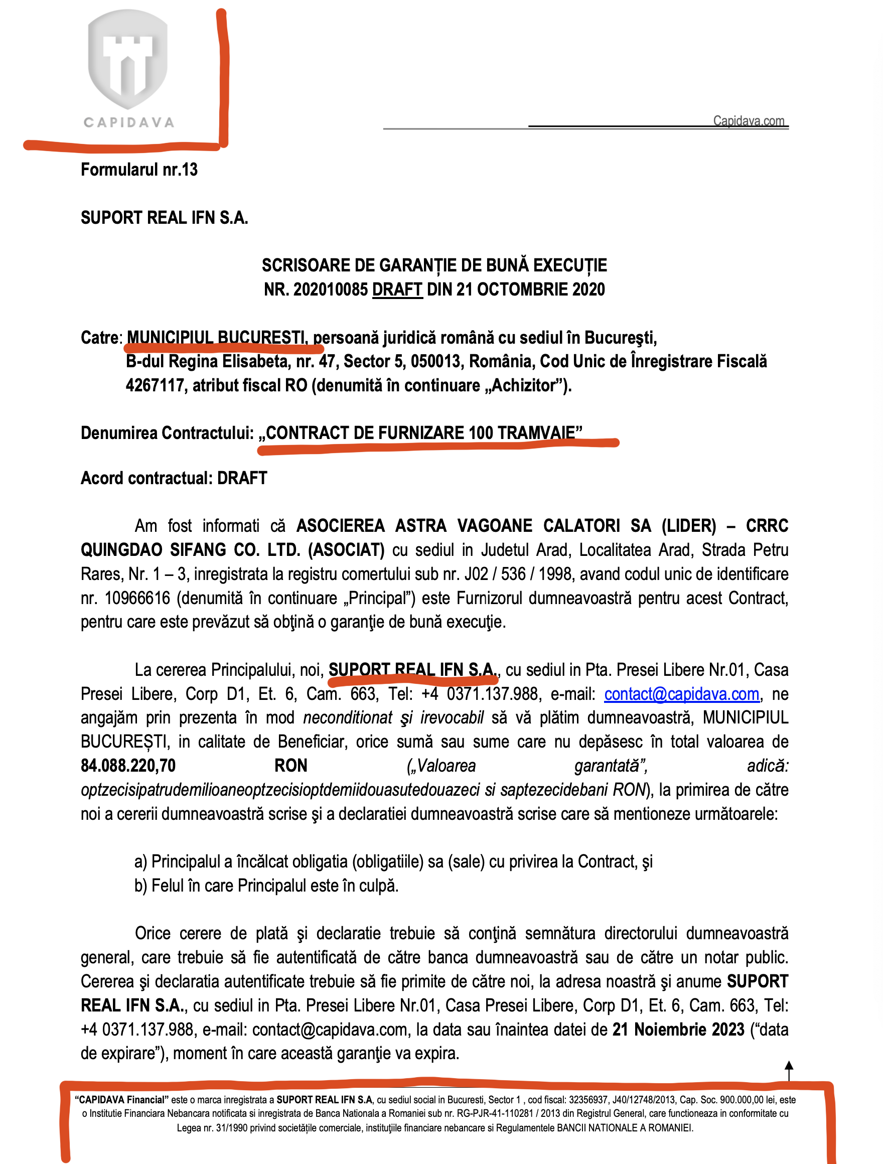 Observați în documentul de mai jos că pe antetul hârtiei apare Capidava, dar IFN-ul care este parte din contract se numeste SUPORT REAL SA.