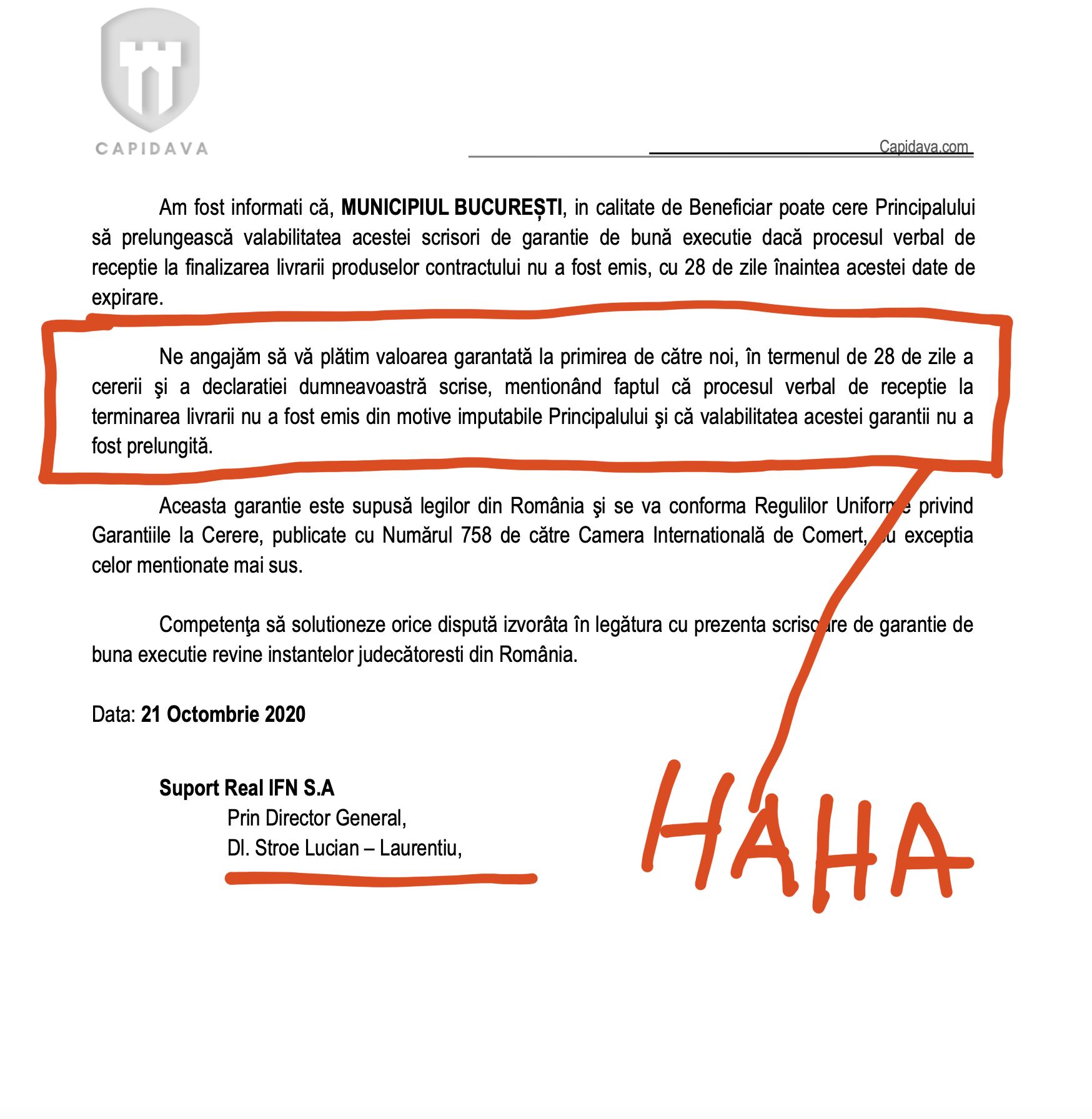 Dezvăluirile noastre au scuturat bine de tot viesparul șmenarilor financiari aciuați după siglele Capidava și Rochester Bank, niște vehicule financiare inexistente, care utilizează niște IFN-uri de tip carcasă prin intermediul cărora emit scrisori de garanție false cu care mai apoi companiile românești sau private se duc la licitații pe bani grei sau chiar semnează contracte foarte mari cu statul român așa cum e cazul în exemplul de față.