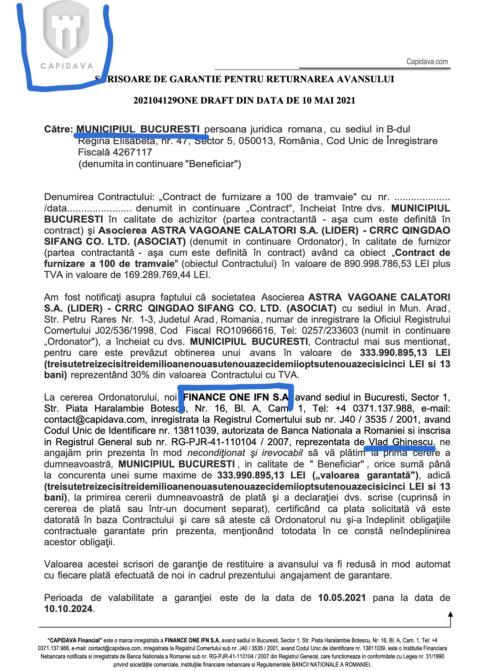Așa cum vă spuneam ieri, escrocii de la Capidava folosesc în mod deliberat IFN-urile pe post de carcasă, emit câte scrisorii de garanții false pot, nu raportează nimic la BNR, iar când BNR se prinde și îi suspendă sau îi radiază, țeparii Capidava se repliază și introduc un nou IFN în joc. Așa a fost și cazul contractului Capidava cu Astra Vagoane, când după radierea Suport Real IFN, Capidava a băgat imediat în schemă Finance One IFN SA. Iată mai jos și dovada: