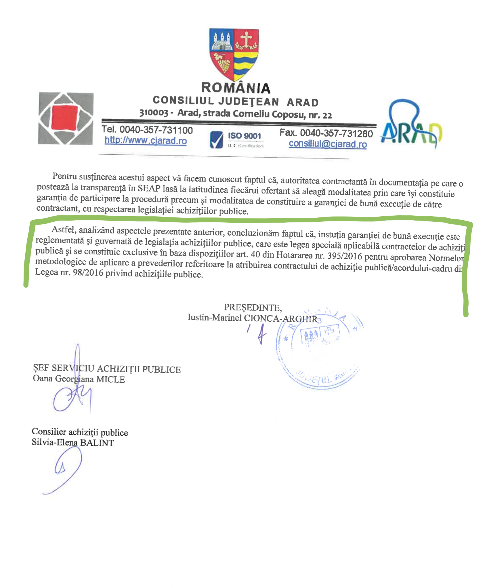 În altă parte a țării, juriștii Consiliului Județean Arad și specialiștii în achiziții publice ai instituției au refuzat acum câteva zile orice colaborare cu Finance One, motivând clar ca lumina zilei de ce Consiliul Județean Arad nu poate accepta de la Capidava/Finance One scrisori ilegale de garanție. Iată mai jos documentul: