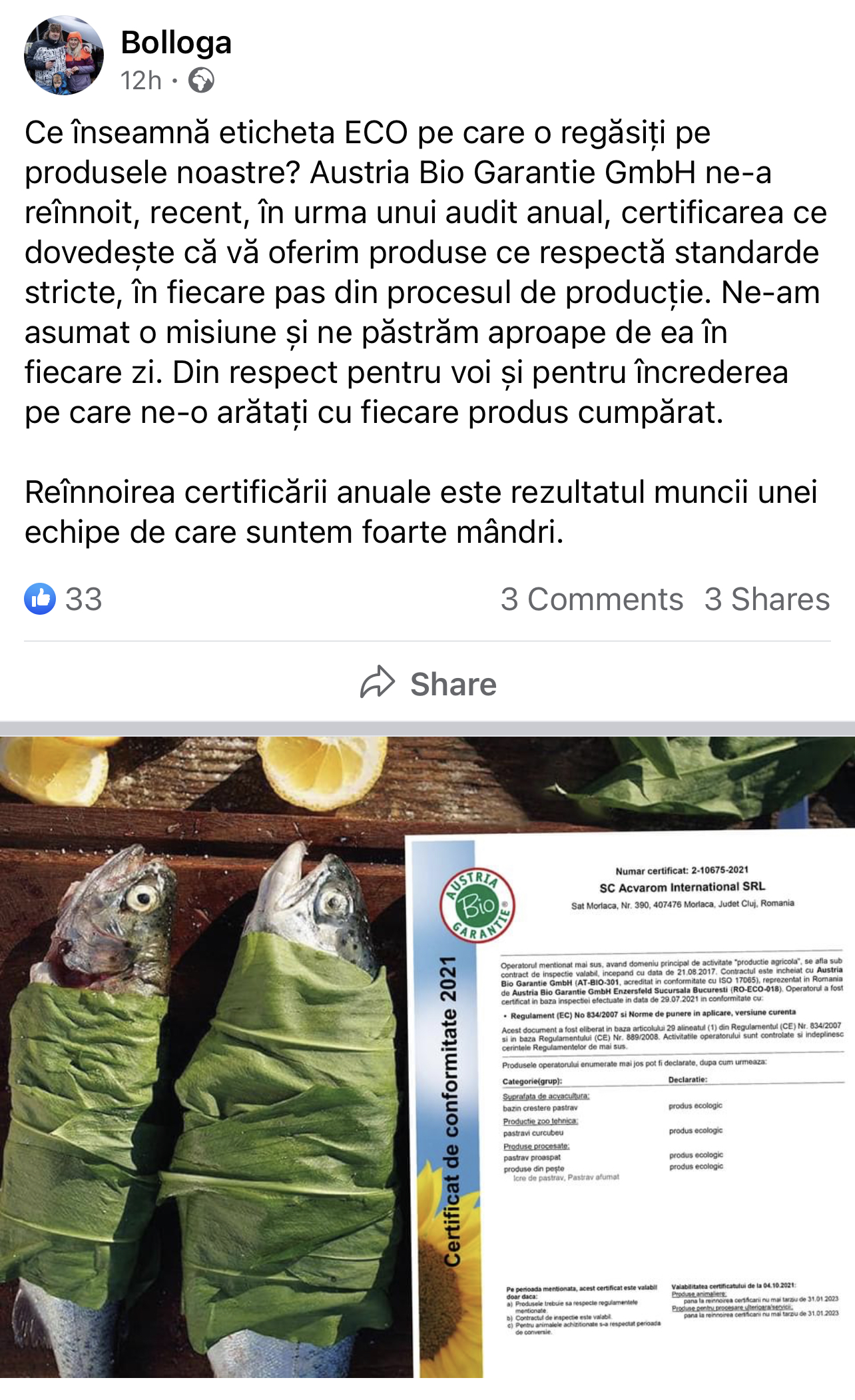 După două zile de la dezvăluirile noastre, patronii de la păstrăvăria Bolloga au catadicsit să posteze pe pagina de Facebook ceea ce pare să fie un certificat de atestare ecologică din partea subsidiarei române a firmei austriece Austria Bio Garantie