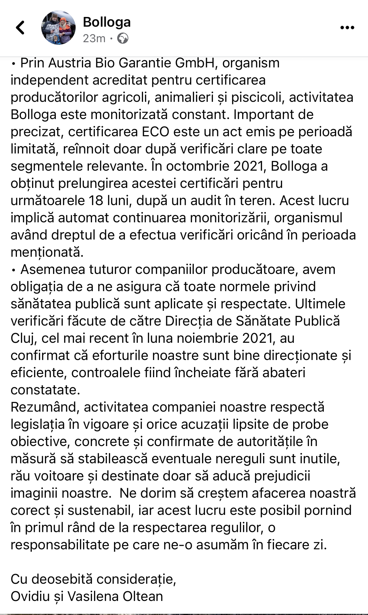 Postarea de dimineață a patronilor, cu certificatul ecologic emis de Austria Bio Garantie, era menit să închidă gura târgului, dar nu a făcut decât să nască noi întrebări. Transparenți, patronii Vasilena și Ovidiu Oltean au închis secțiunea de comentarii, interzicându-le clujenilor să le adreseze întrebări.