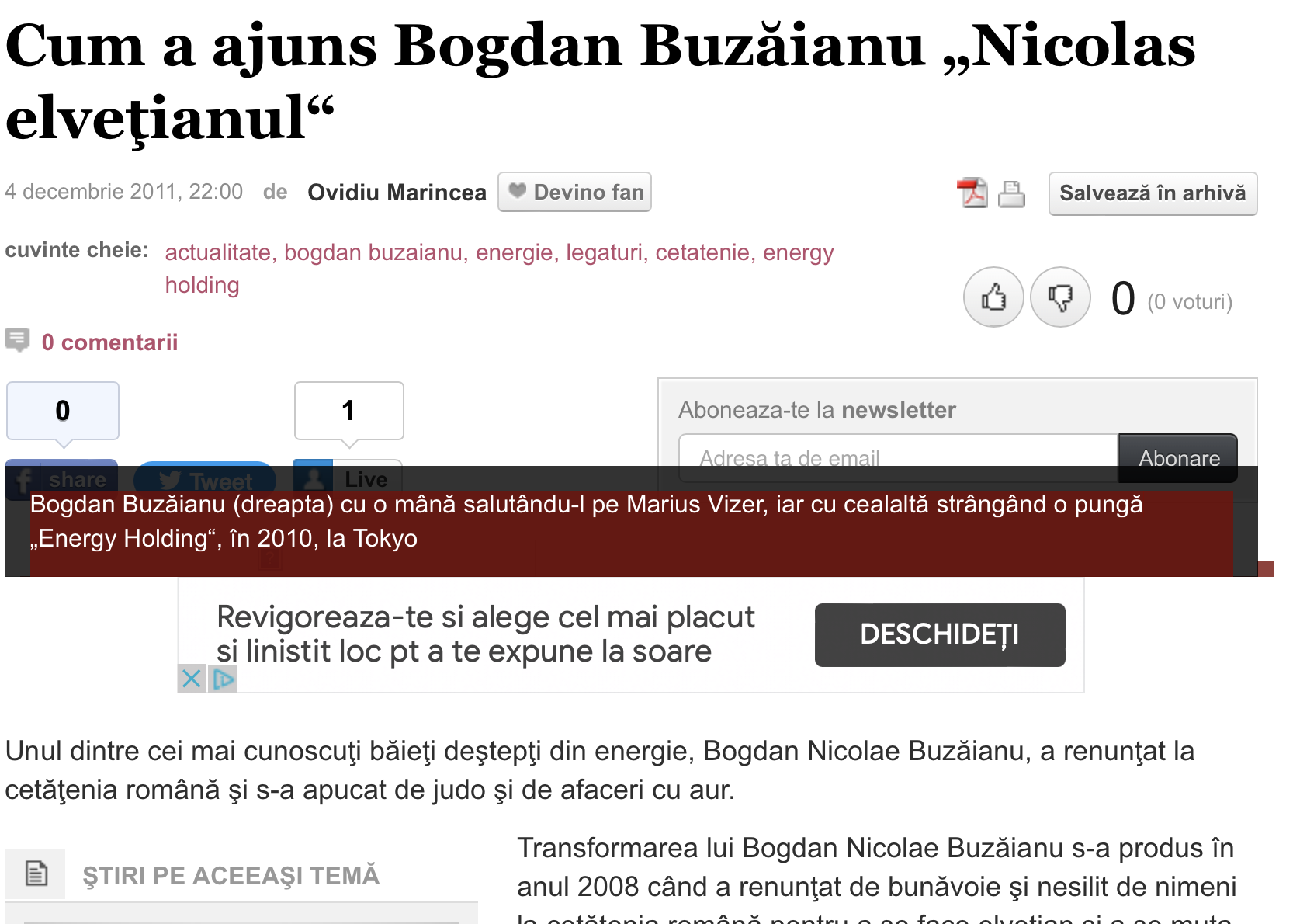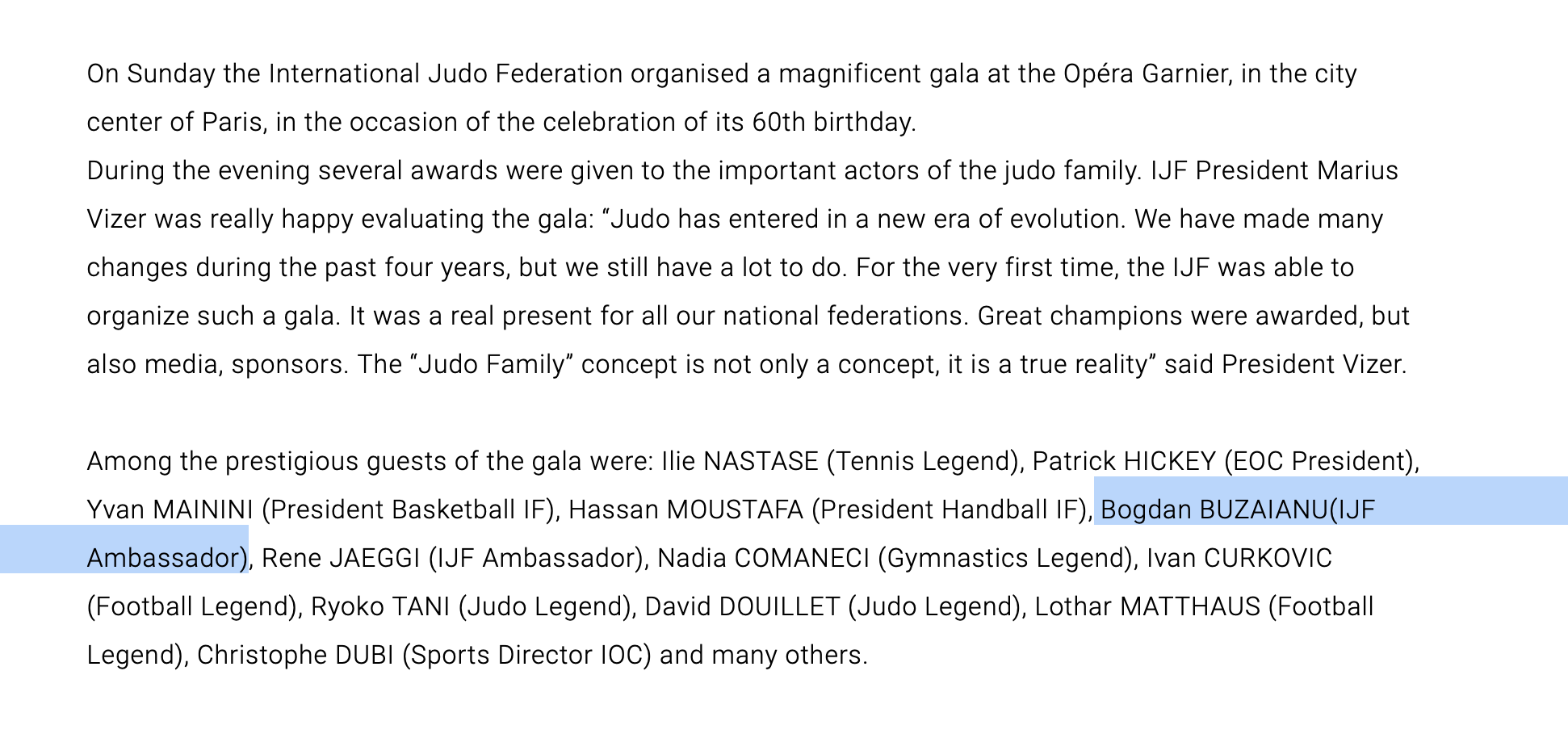 Pentru că ne plac și nouă amintirile, chiar dacă sussemnatul este un biet jurnalist de provinice ce speră la gloria bucureșteană, dar și pentru că tot subsemnatul are ouă mai tari decât ale multor pseudo-jurnaliști de București, mi-am adus aminte de o fotografie foarte frumoasă din 2010 cu Bogdan Buzăianu dând mâna colocvial cu unul dintre cei mai bogați și influenți români, Marius Vizer, președintele Federației Internaționale de Judo.