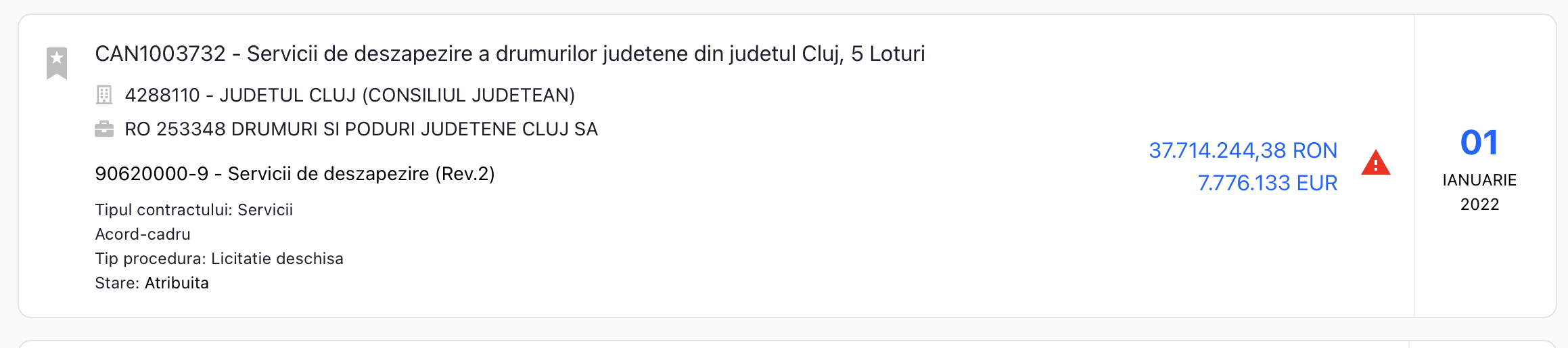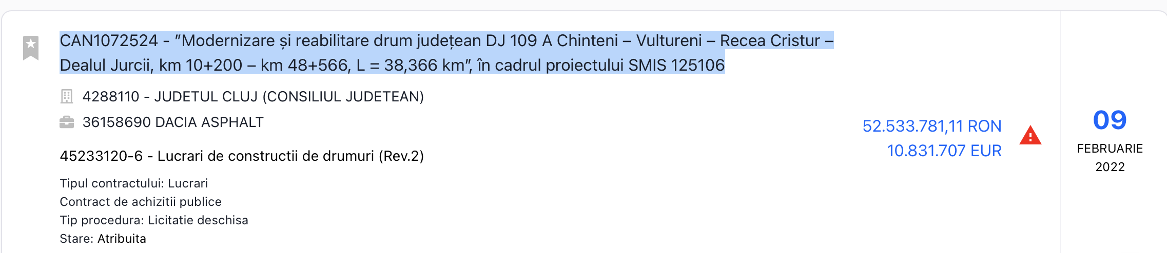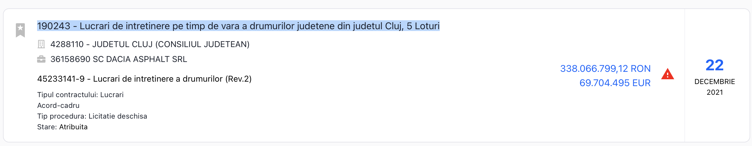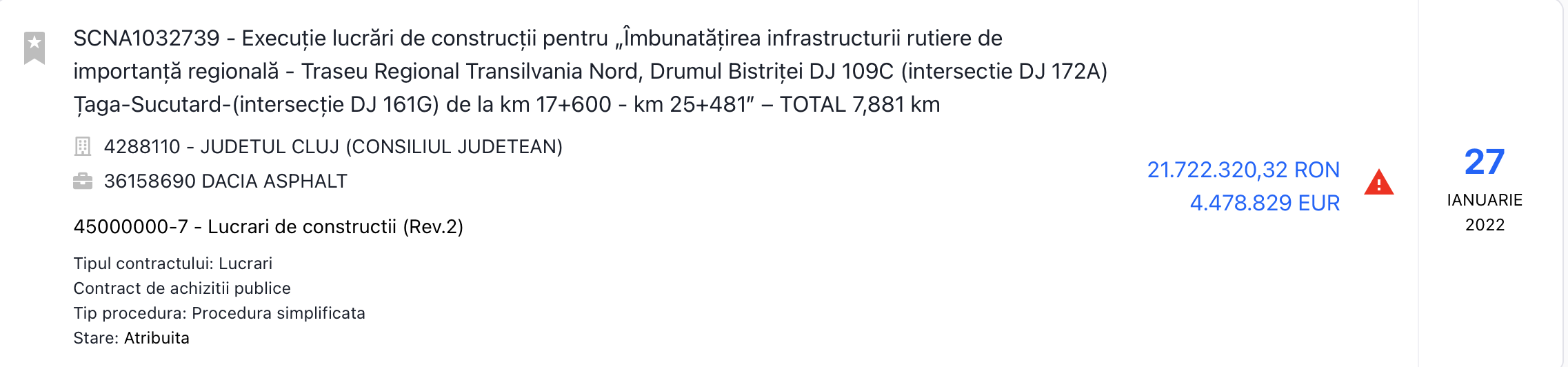 Dar nu e o problemă pentru Alin Tișe, Consiliul Județean a băgat în 2021 incredibila cifră de peste 130 de milioane de euro în firma Dacia Asphalt. Mai jos aveți marile licitații ale CJ Cluj din august 2021 și până acum. Doar drumuri și deszapeziri, plus o tonă de bani băgați în proiectul eșuat al CMID - Centrul de management Integrat al deșeurilor.