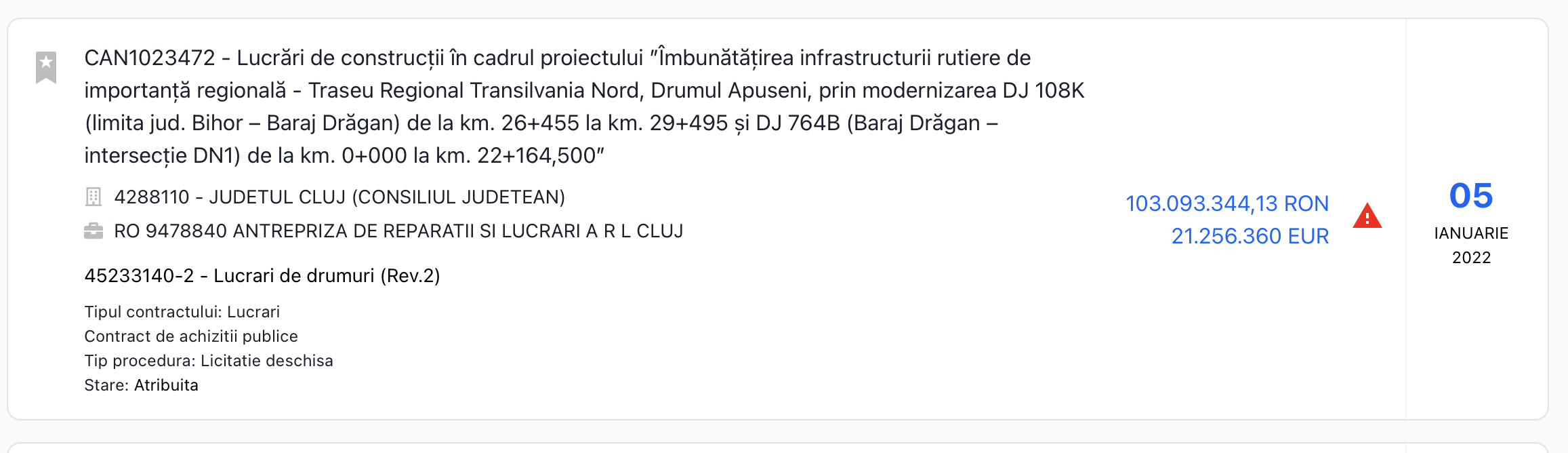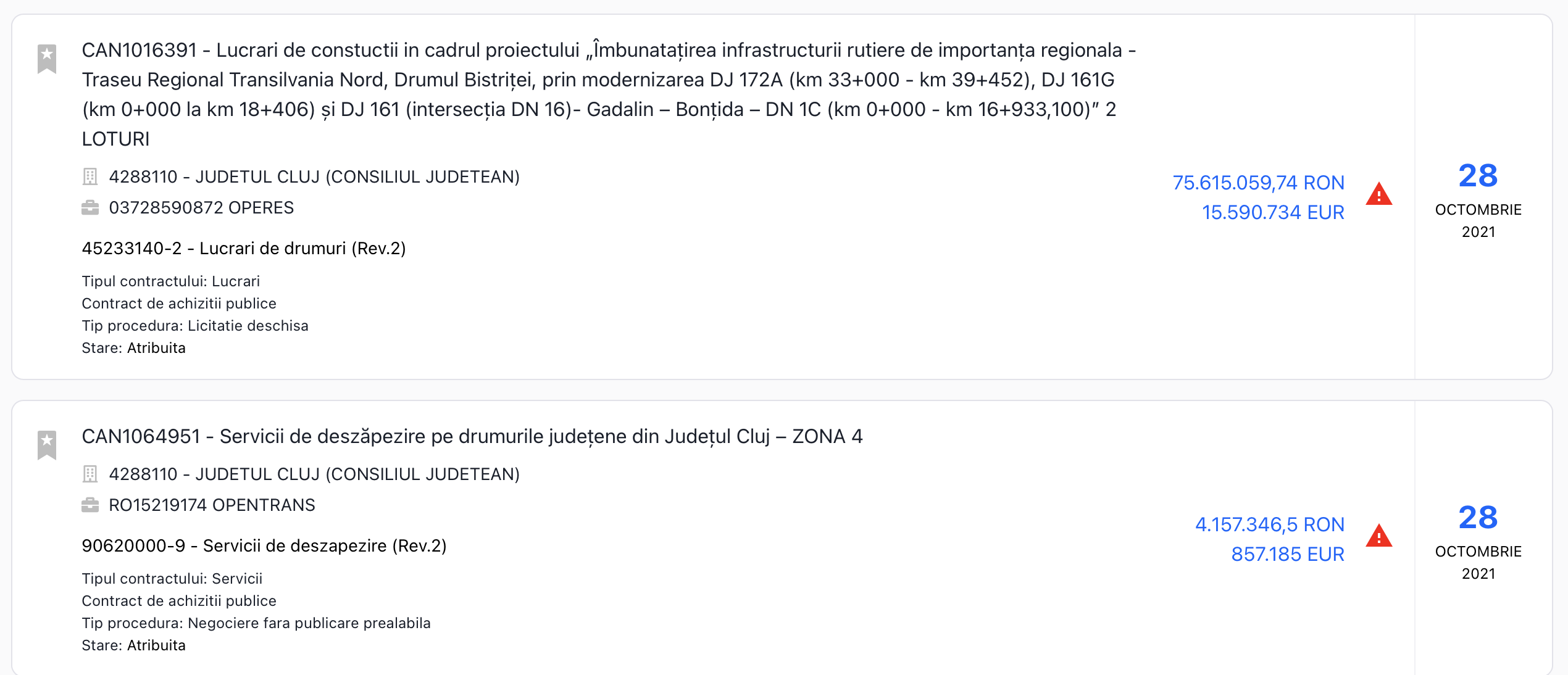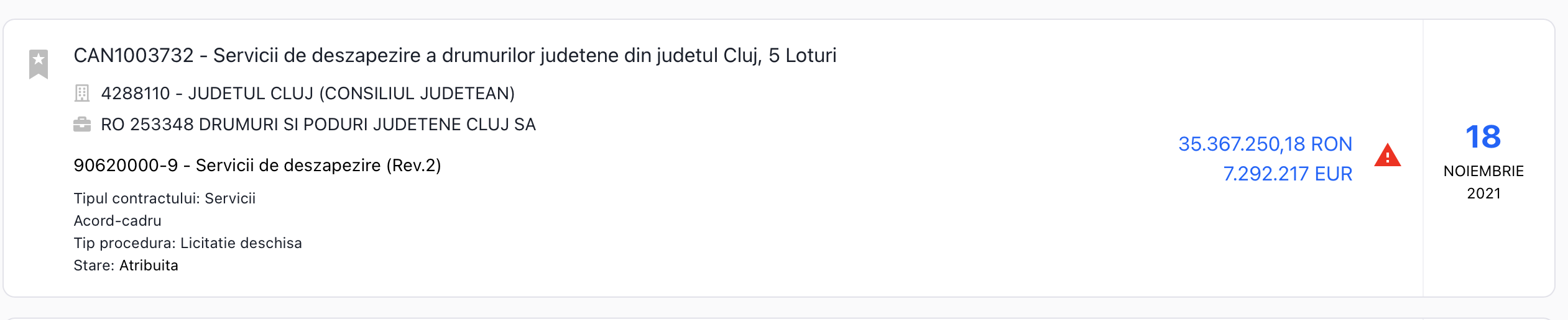 Dar nu e o problemă pentru Alin Tișe, Consiliul Județean a băgat în 2021 incredibila cifră de peste 130 de milioane de euro în firma Dacia Asphalt. Mai jos aveți marile licitații ale CJ Cluj din august 2021 și până acum. Doar drumuri și deszapeziri, plus o tonă de bani băgați în proiectul eșuat al CMID - Centrul de management Integrat al deșeurilor.
