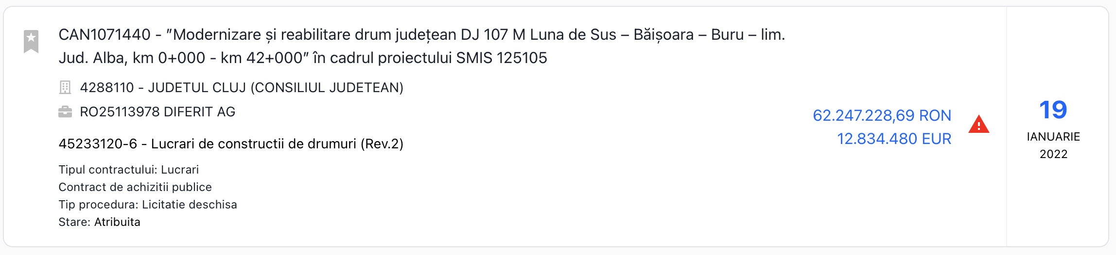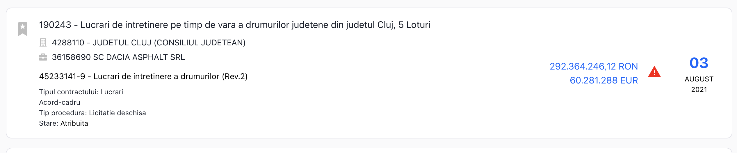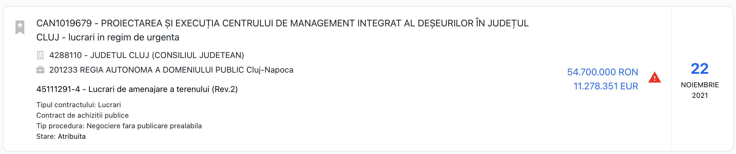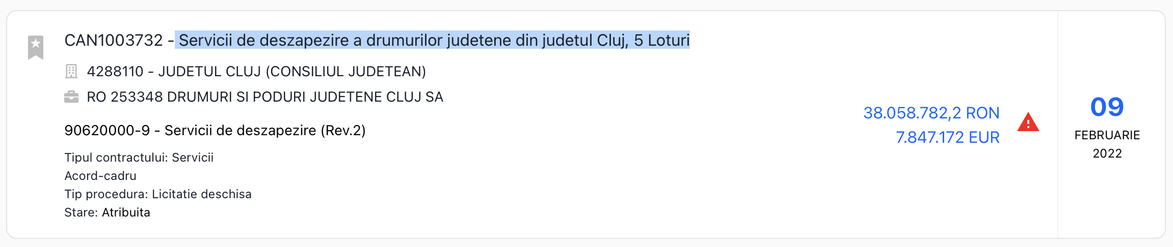 Dar nu e o problemă pentru Alin Tișe, Consiliul Județean a băgat în 2021 incredibila cifră de peste 130 de milioane de euro în firma Dacia Asphalt. Mai jos aveți marile licitații ale CJ Cluj din august 2021 și până acum. Doar drumuri și deszapeziri, plus o tonă de bani băgați în proiectul eșuat al CMID - Centrul de management Integrat al deșeurilor.