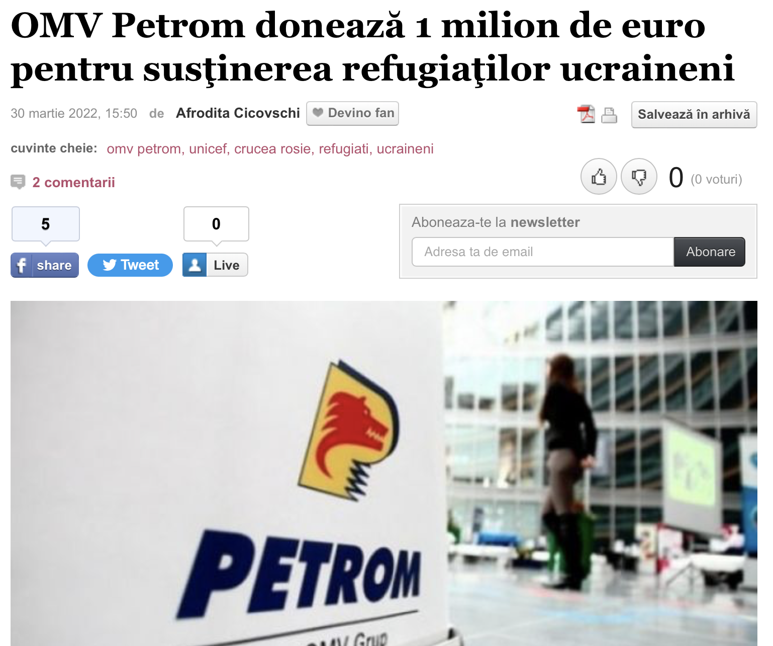 But isn't it even more sadistic and sadder to see that OMV Petrom Romania reeks of hypocrisy, on the one hand donating one million euros to Ukrainian refugees, on the other, preparing to put a 20 million euro auction on their plate of euro "arrows" Varvara Cornel, the proxy of a close relative of the criminal Putin?