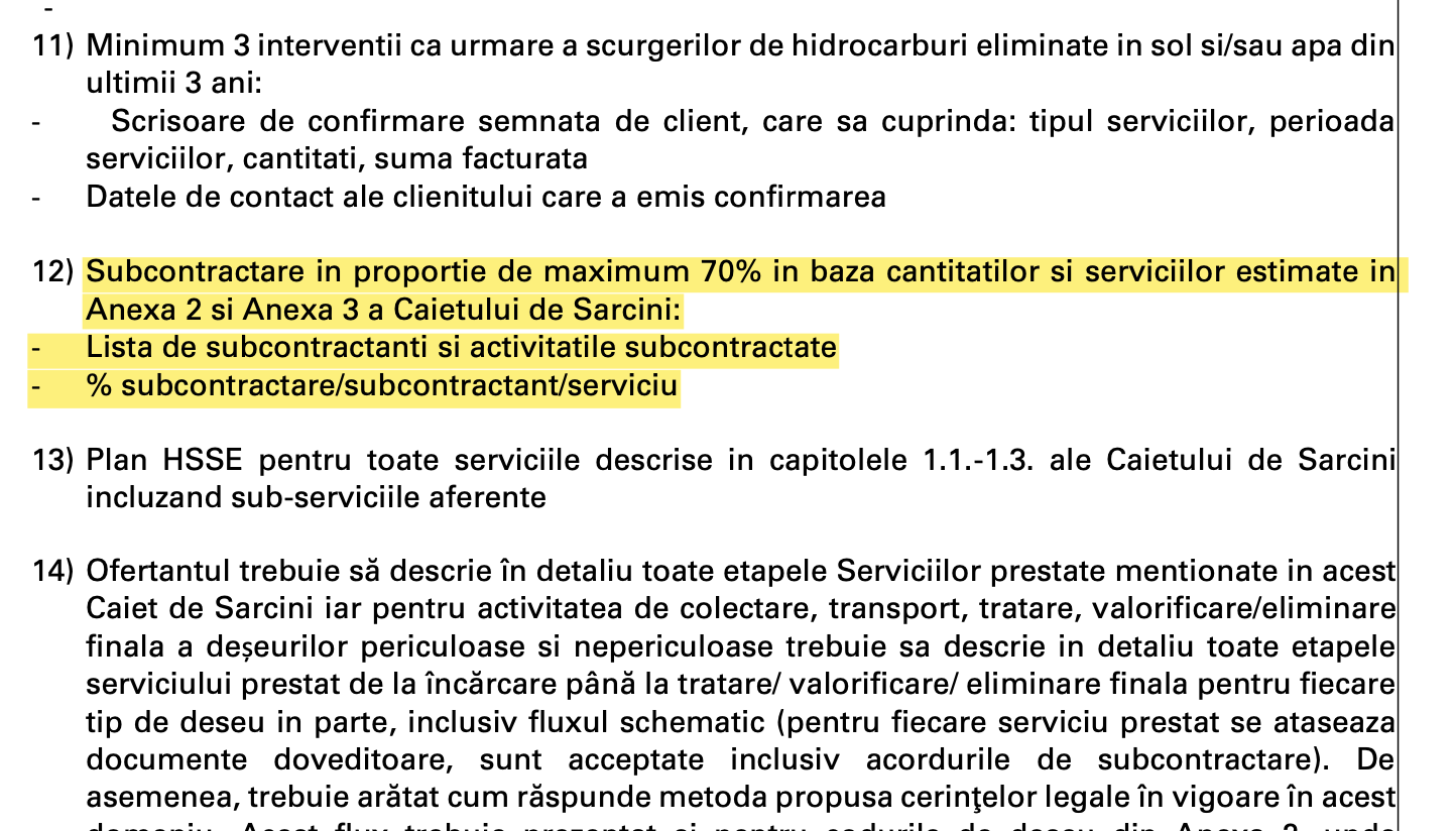 In the qualification criteria, a flat company like Uni Recycling is allowed to cover itself with the similar experience of subcontractors, which is unprecedented, as this has never been allowed before in the big tenders organized by OMV Petrom.