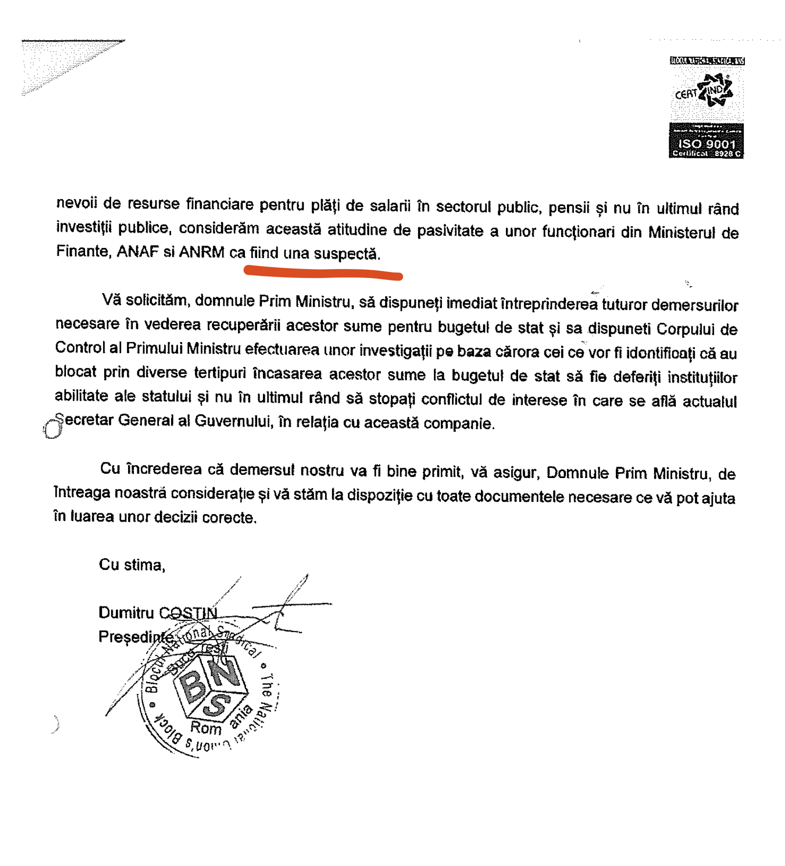 Dumitru Costin, the president of the National Trade Union Bloc (BNS), was also invited on November 9, 2017, in the framework of the Parliamentary Commission of Inquiry into the activity of ANRE, where he made a nuclear noise saying that "OMV Petrom" had damaged the Romanian state with 7 billion lei , according to checks made by the Court of Accounts, but the money has not been recovered from 2015 until now.