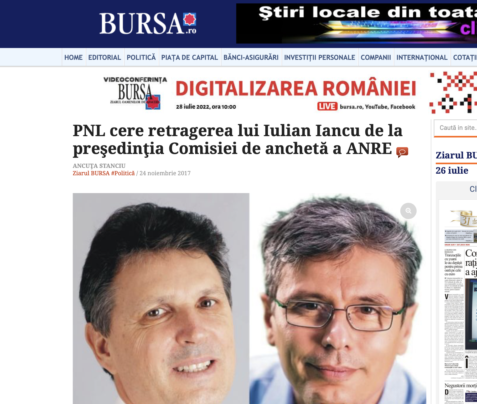 "Biroul executiv al PNL a decis, în această săptămână, să ceară celor două Camere ale Parlamentului retragerea lui Iulian Iancu de la preşedinţia Comisiei de anchetă a activităţii ANRE (Autoritatea Naţională de Reglementare în domeniul Energiei), ne-a declarat deputatul PNL Virgil Popescu, membru al Comisiei, menţionând că sesizarea PNL va fi depusă săptămâna viitoare.