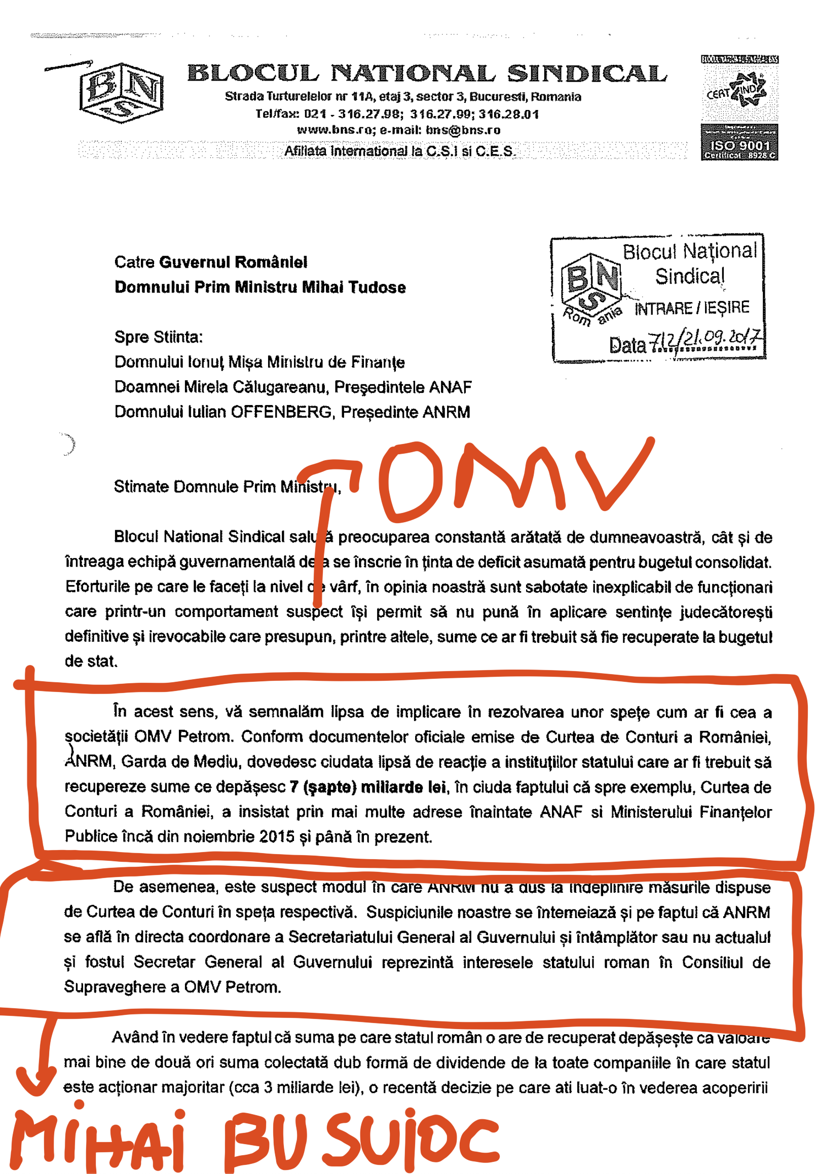 Dumitru Costin, şeful Blocului Naţional Sindical (BNS), a prezentat Comisiei de anchetă a activităţii ANRE un document care a fost depus şi la Guvernul României, respectiv la Secretariatul General al Guvernului, în atenţia premierului de atunci, în care Costin spune că, la adresa OMV, a primit documente de la autorităţile statului român care sunt sau au fost în diverse etape într-o procedură de investigaţie a unui comportament evazionist în cazul plăţii salariilor, în cazul TVA, de modificare de formulă şi neplată corectă a redevenţei care, din datele prezentate, se ridică la peste un miliard de euro, date susţinute ca urmare a raportului făcut de Curtea de Conturi.