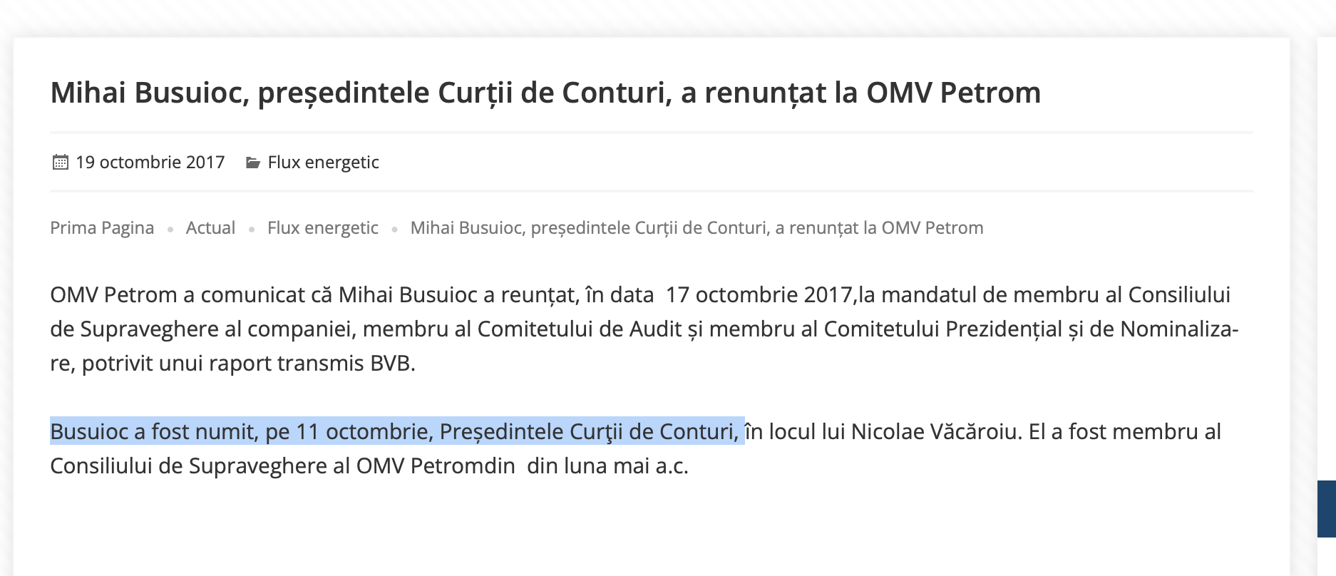 Știți ce a ajuns Mișu Busuioc, da? Șeful Curții de Conturi România, ahahaha, până ninge nu va mai ieși vreun raport nefavorabil la adresa OMV Petrom sau vreo cerere către ANAF de recuperare a banilor!